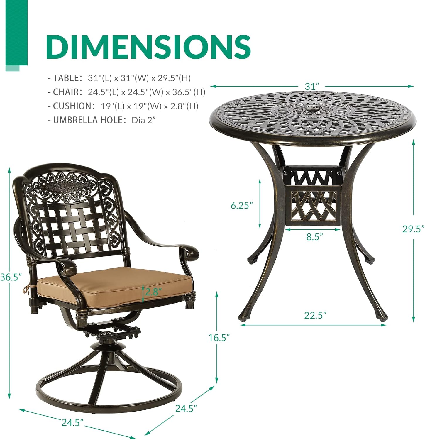 - 【STYLISH APPEARANCE】 - This 3-Piece Dining Set includes 2 swivel dining chairs and 31" round cast table. Elegant cast accents scroll across the chairs and table top, adding a level of sophistication and craftsmanship to the collection. Perfect addition to your patio, yard, deck, or porch.