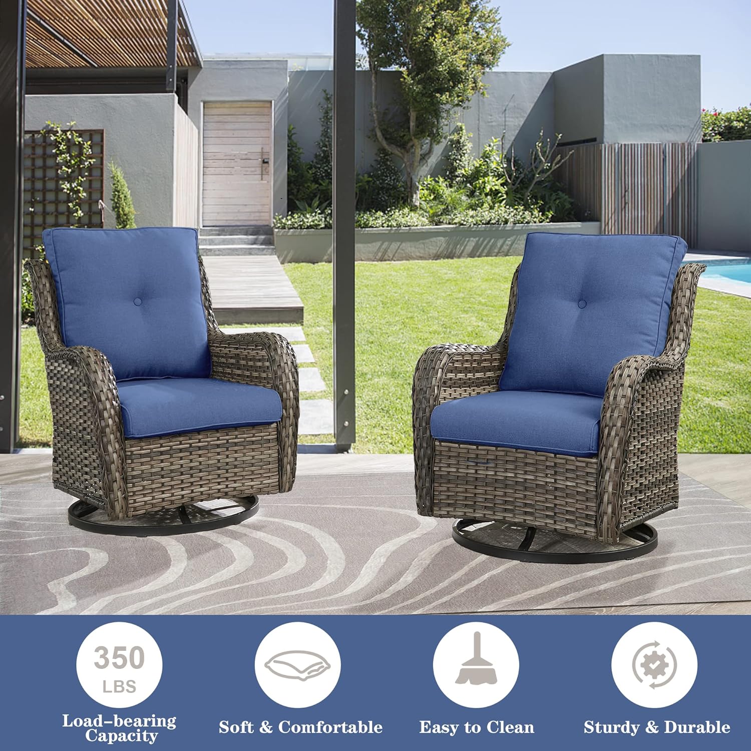 5 Piece Outdoor Patio Furniture Set - Wicker Furniture Patio Conversation Set, Outdoor Swivel Rocker Chairs with 3-Seater Sofa and 2 Ottomans for Small Space, Blue Cushion