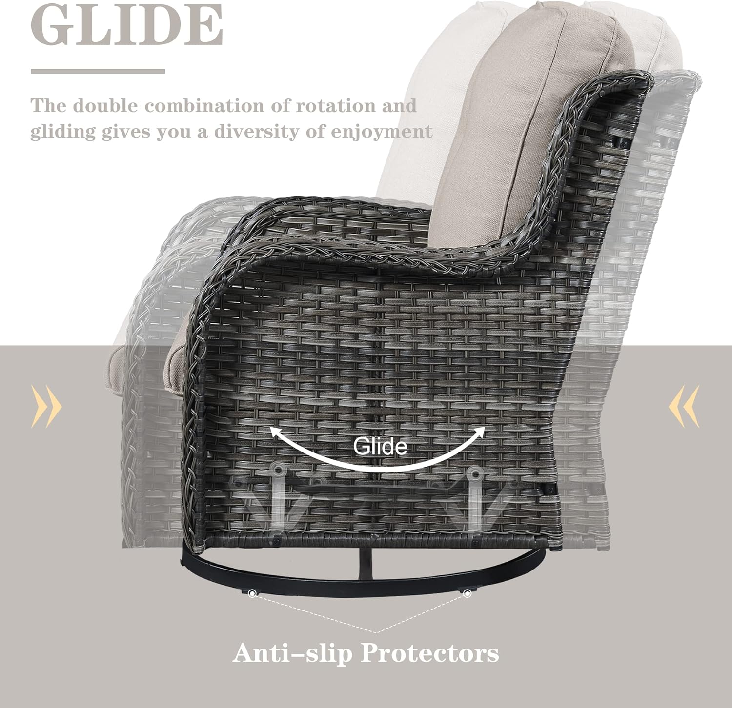 - Swivel And Glide Combo: The base of the swivel rocker chair is designed with a combination of rotating and gliding, which makes it possible not only to rock back and forth, but also to rotate 360 degree compared to traditional rocking chairs, the comfort of this upgraded wicker rocking chair will absolutely amaze you