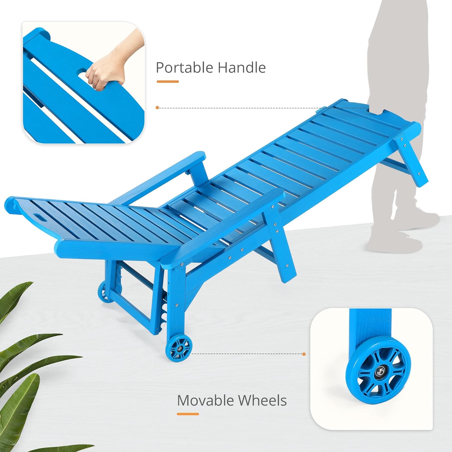LUE BONA Outdoor Chaise Lounge, 79'' Oversized HDPS Chaise Lounger, 5 Positions Adjustable Lounge Chairs, Pool Lounge Chair with Wheels for Poolside, Backyard, 3 Year Warranty, Blue