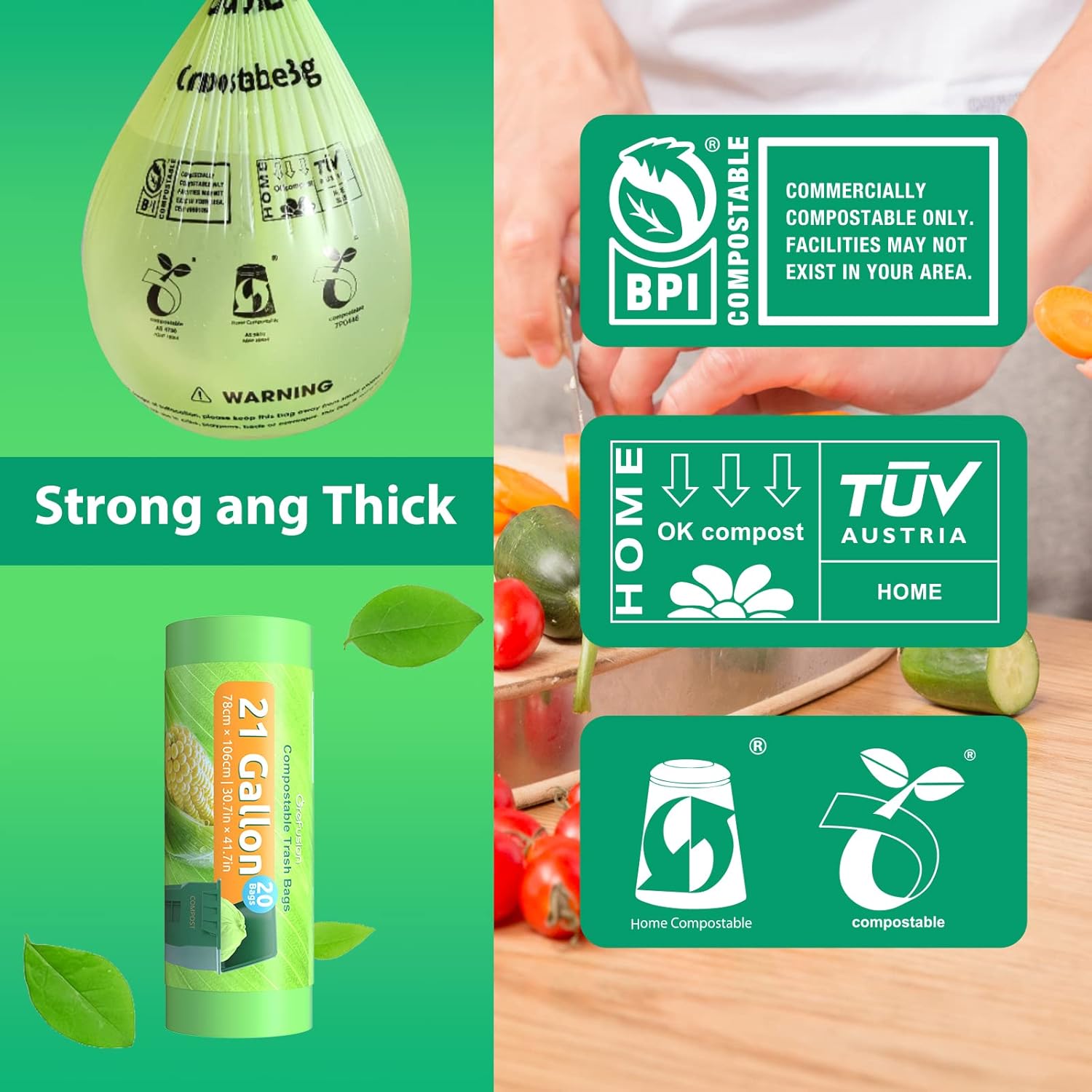 - 【FOR FOOD WASTE&YARD WASTE&ORGANIC WASTE RECOVERY】The GreFusion compostable trash bag size of 21 gallon are great for compost bin kitchen to collect food scraps,also can be used as kitchen trash bags, yard waste bags .The large compost bags are perfectly fit most large compost can design with star-sealed at the bottom. Kitchen compost bags are extra thick 1.28 Mils, durability leave no space to leak and not easy to tear