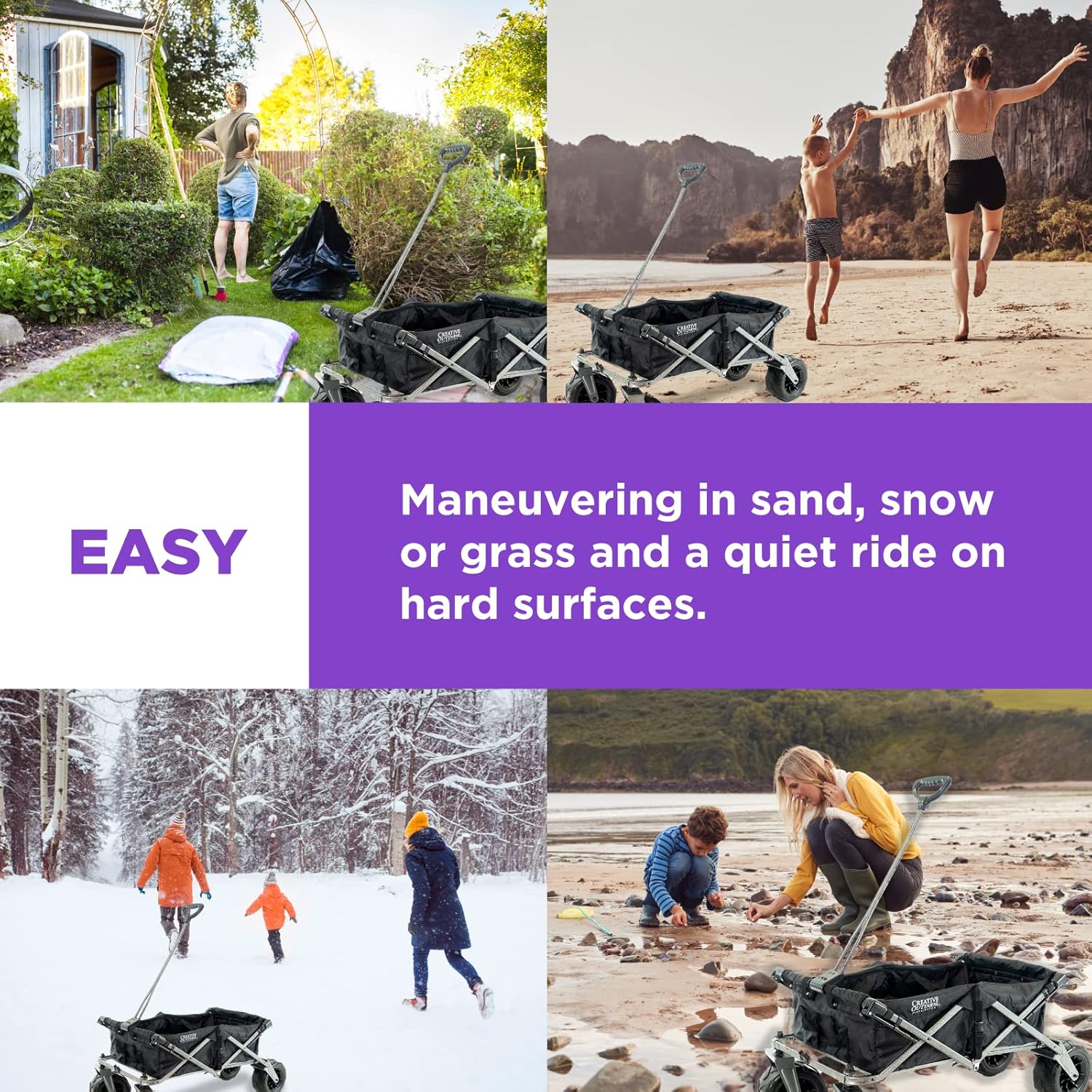 - HUGE RUBBER ALL-TERRAIN WHEELS - Comes equipped with ball bearings for decreased rolling resistance and increased load capacity. You can smoothly glide across many surfaces including grass, dirt, concrete, pavement, sandy beaches, and more! The front wheels swivel 360 degrees to allow a tight turning radius and easily maneuver around obstacles and navigate the terrain. The bigger wheels dampen the bumps in your path so the precious cargo and passengers experience a smooth ride.