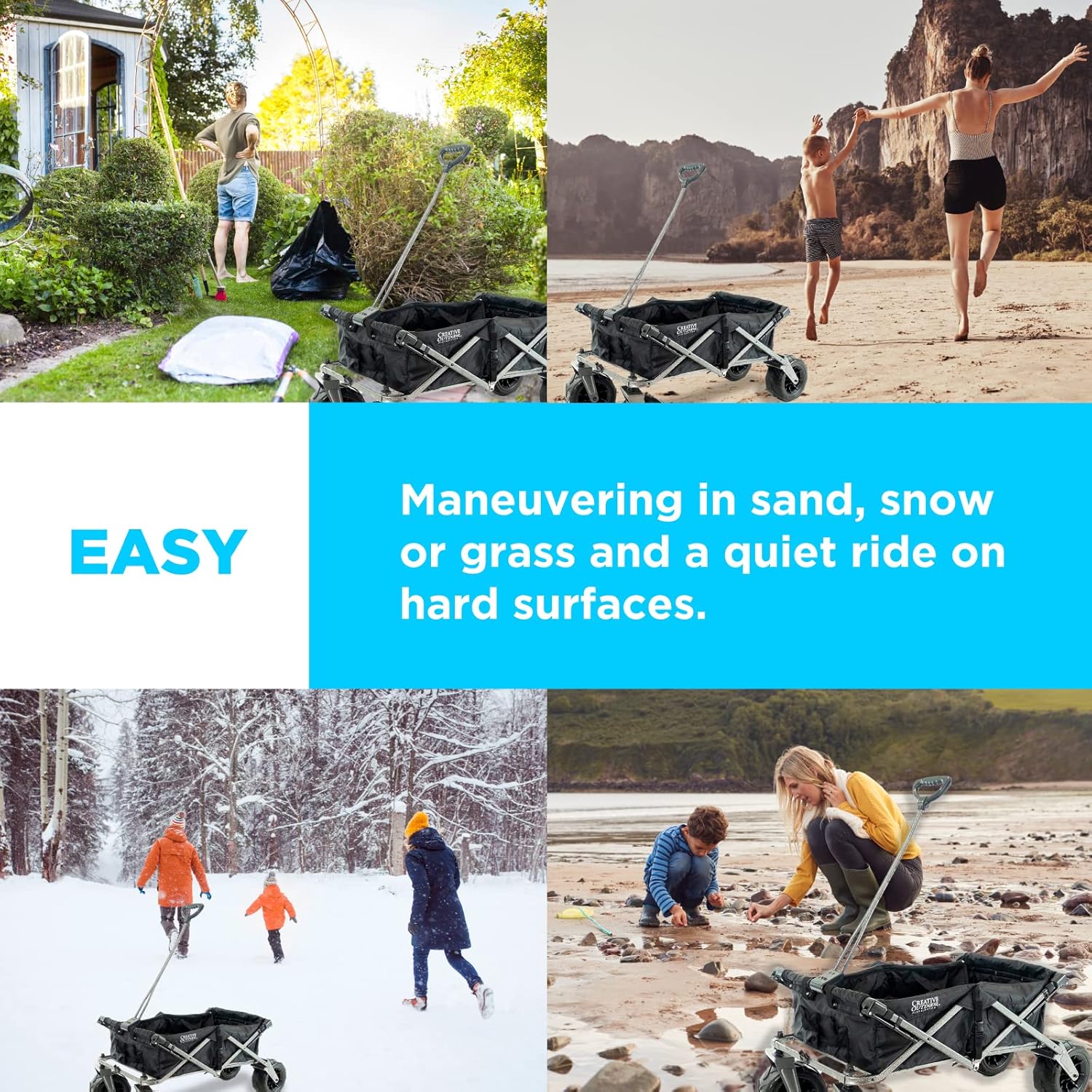 - HUGE RUBBER ALL-TERRAIN WHEELS - Comes equipped with ball bearings for decreased rolling resistance and increased load capacity. You can smoothly glide across many surfaces including grass, dirt, concrete, pavement, sandy beaches, and more! The front wheels swivel 360 degrees to allow a tight turning radius and easily maneuver around obstacles and navigate the terrain. The bigger wheels dampen the bumps in your path so the precious cargo and passengers experience a smooth ride.