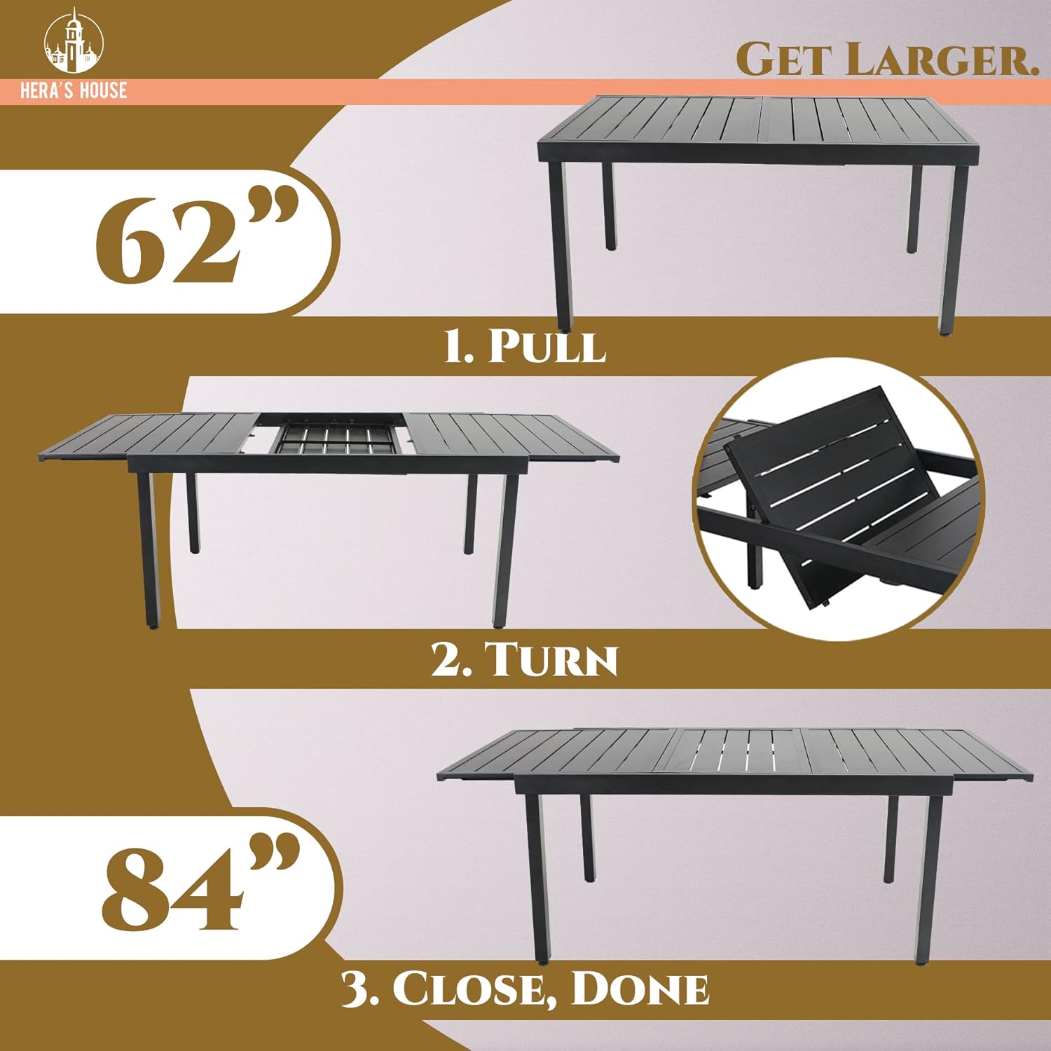 - 【62"/84" MORDEN EXTENDABLE SLATTED METAL TABLE TOP】Large rectangle surface for 6-8 person, enough space for your leisure time with your friends or family. HERA’S HOUSE slatted metal table top leaves enough water seepage gaps, which is easy to clean and won’t accumulate water. Expandable table top with 2 sizes (62" and 84") meet your actual needs.