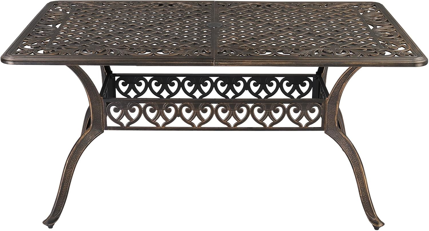 Outvita 59inch Patio Dinning Table, Outdoor Cast Aluminum Large Rectangle Table with Umbrella Hole and Antique Design for Backyard Pool Balcony Deck