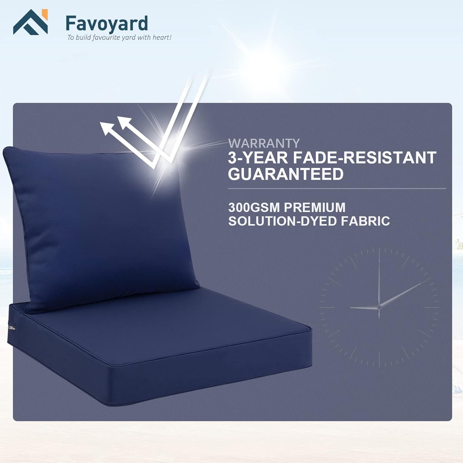 - 3-Year Fade Resistance Fabric: Our Favoyard outdoor chair cushions is made of solution-dyed fabric. This kind of fabric usually used with outdoor circumstance because of it’s color fastness. With the help of the fabric our patio furniture cushion could last 3 years color fastness. And we are confident our cushions could withstand at least 1500h intense midday sunlight.