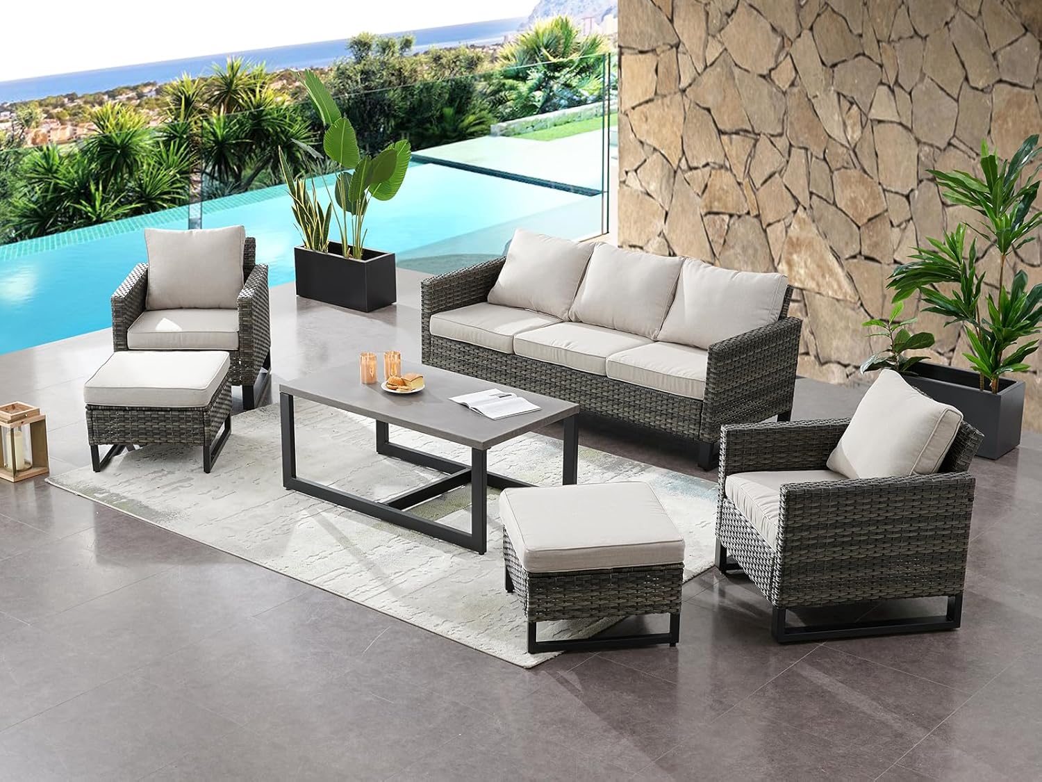 HUMMUH 6 Piece Patio Furniture All Weather Wicker Outdoor Sectional Sofa,High Back Patio Chairs,Coffee Table and Ottomans Set for Porch,Garden,Backyard