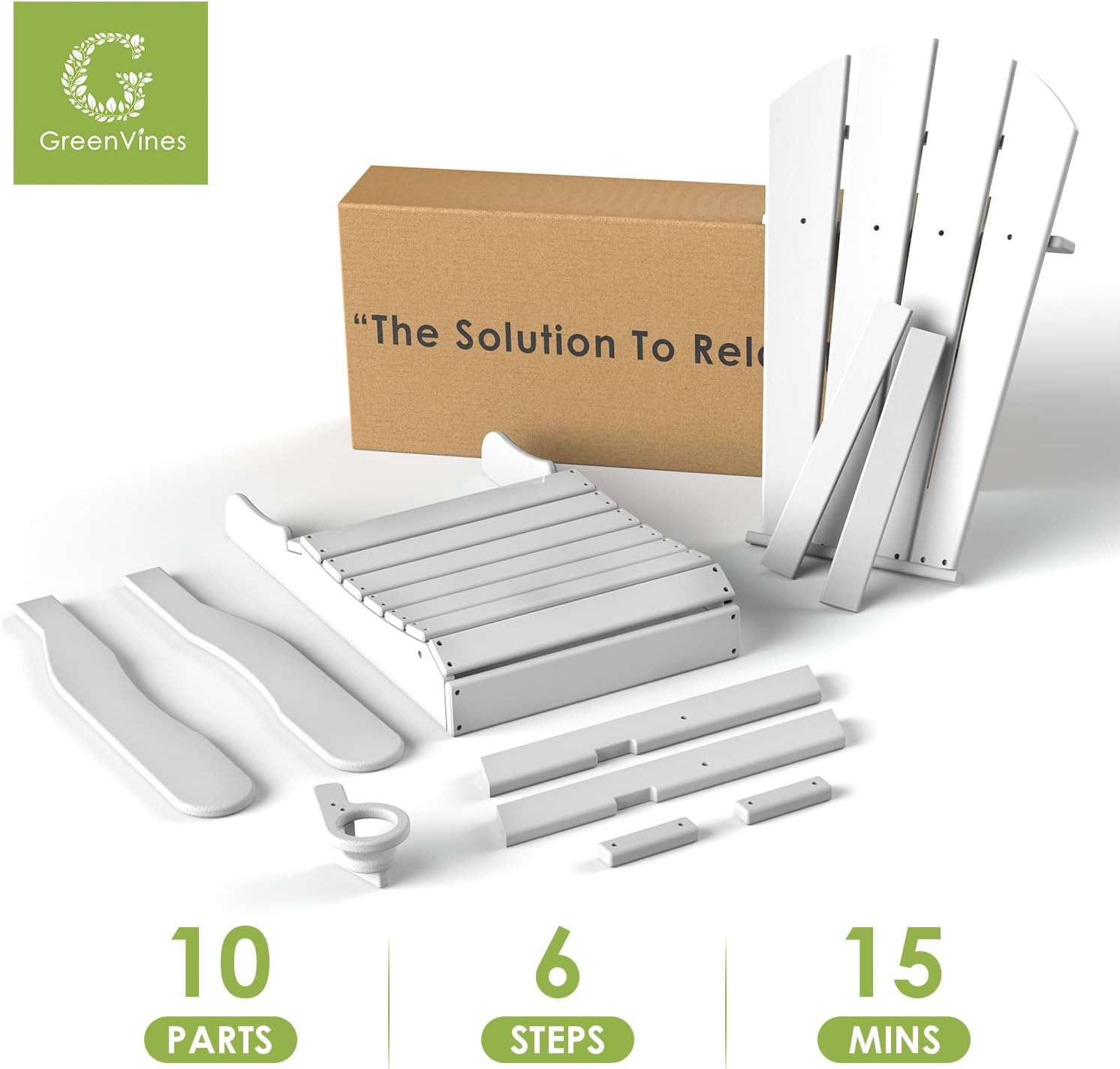 - 【True HDPE】 Upgrade your outdoor experience with GreenVines HDPE (High Density Polyethylene) Adirondack chairs. Our composite material offers superior quality and safety compared to typical PE or PS chairs. Unlike traditional wood chairs, our HDPE chairs are waterproof, weather-resistant, fade-resistant, and resistant to chipping, peeling, cracking, and rotting. Choose GreenVines HDPE Adirondack chairs for a reliable and low-maintenance outdoor seating solution