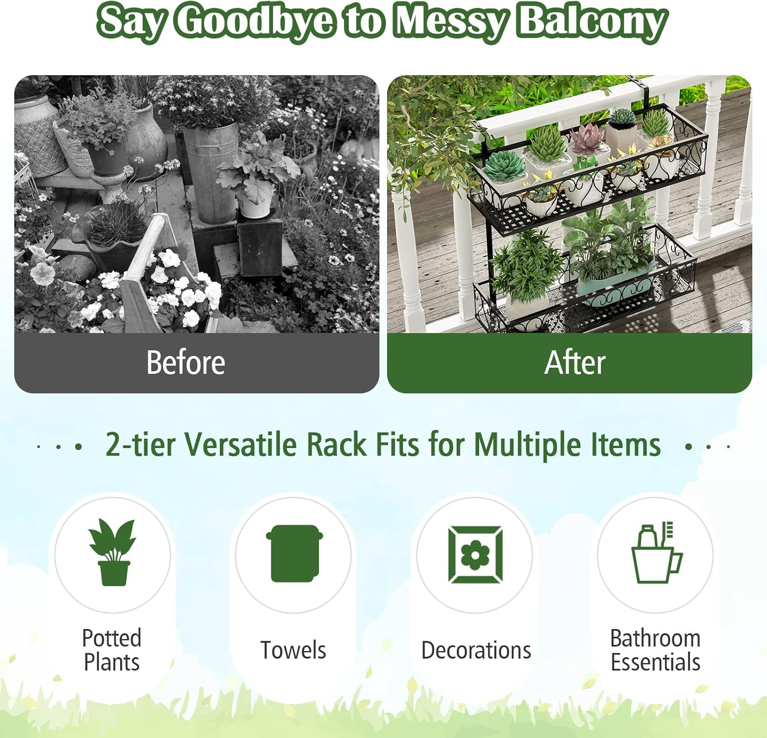 - π 2-Tier Spacious Display Space: The railing flower pot holder features 2-tier 24β x 8β x 5β (L x W x H) shelves, providing spacious space to hold kinds of potted plants. More thoughtfully, the elevated guardrails are helpful to keep flowers stable without falling. And the layered design enables plants to enjoy ample sunshine for healthy growth.