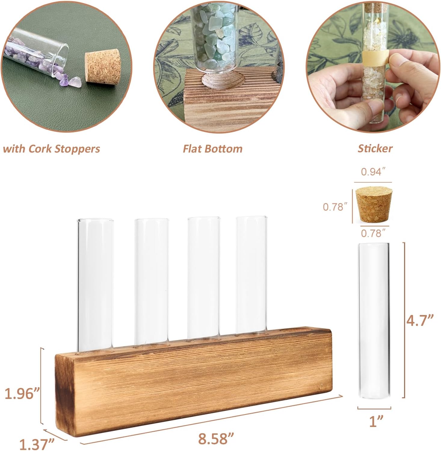 - Flat Test Tubes with Cork Stoppers Size: The glass tube measures approx 4.7" in total height and1" in diameter. The tight cork stopper is insert and take out easily, perfectly fit the tube open and have good sealing to isolate air.