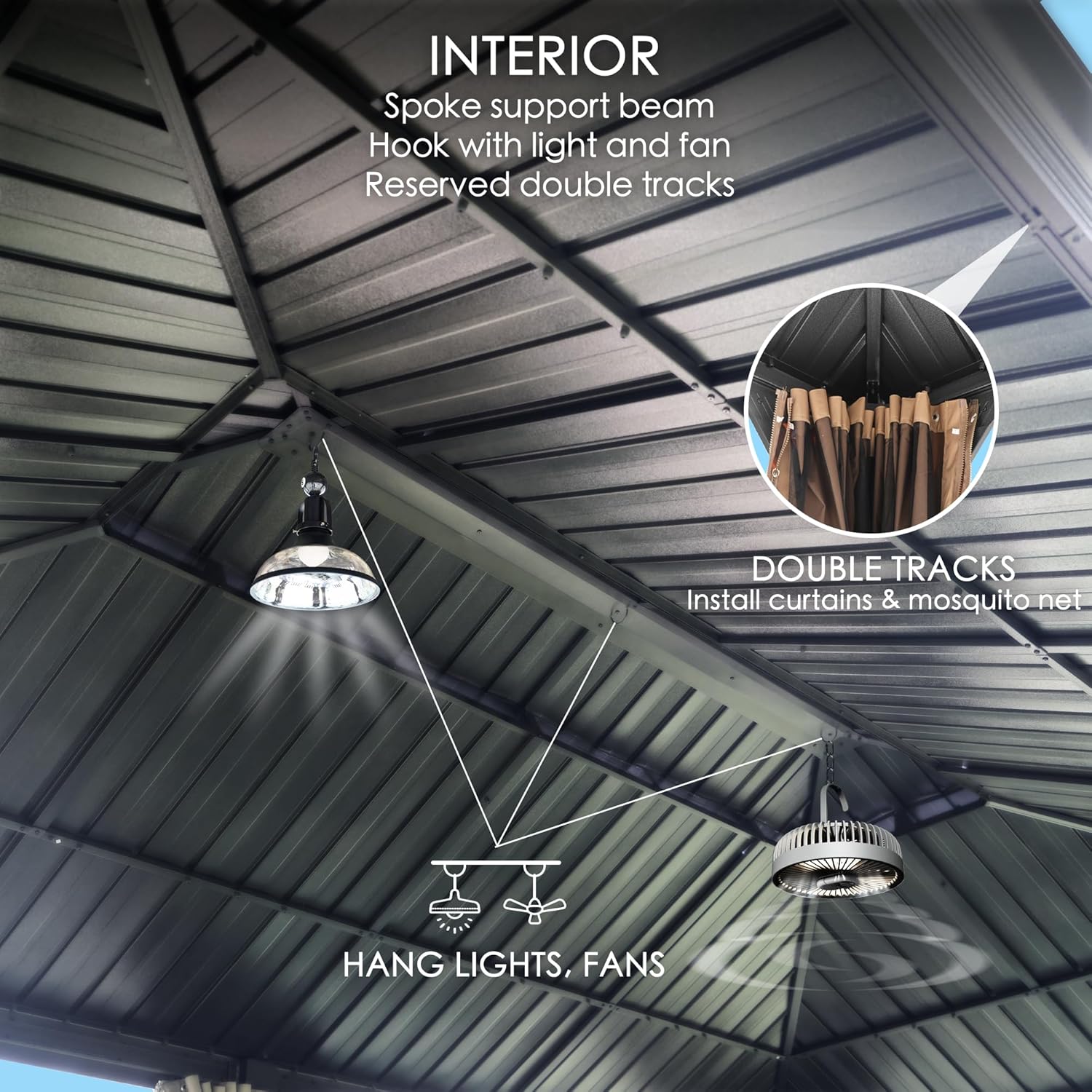 - ✅Curtains and Netting - The hardtop gazebo is equipped with fully enclosed, double-sided zippers, a dual-track system, and double-layer sidewalls. The gray polyester curtains and mesh ensure good ventilation and unobstructed views while offering protection from rain and UV rays, enhancing privacy. This setup creates a safe and comfortable environment for your family.