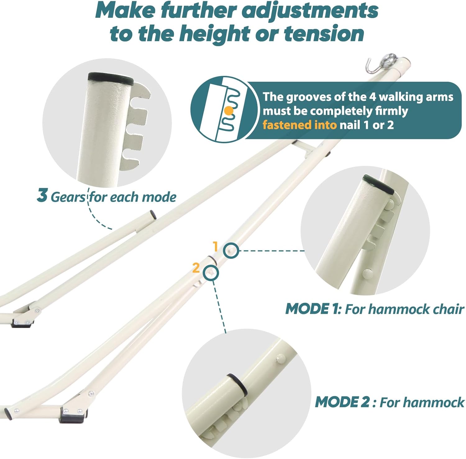 - Easy to Assemble :Hammock stand can be easily set up or take it down in just a few minutes without tools. Removable screw design, with the adjustable hooks on the stand, you can decide how low or high the hammock to swing.Both backyard and portable hammock stands are easy to set up and hang your hammock from. And you donโt need to measure the distance between anchor points.Free yourself from head to toe and enjoy the fun of the hammock stand.