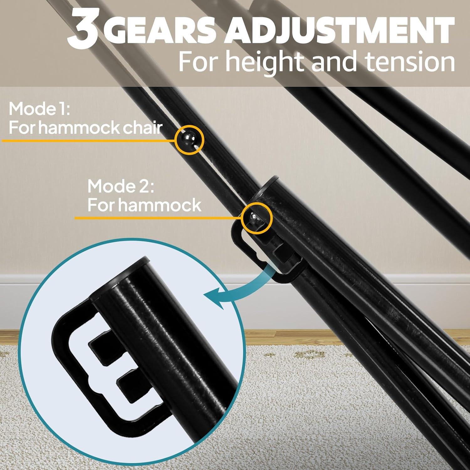 - Easy to Assemble :Hammock stand can be easily set up or take it down in just a few minutes without tools. Removable screw design, with the adjustable hooks on the stand, you can decide how low or high the hammock to swing.Both backyard and portable hammock stands are easy to set up and hang your hammock from. And you donโt need to measure the distance between anchor points.Free yourself from head to toe and enjoy the fun of the hammock stand.