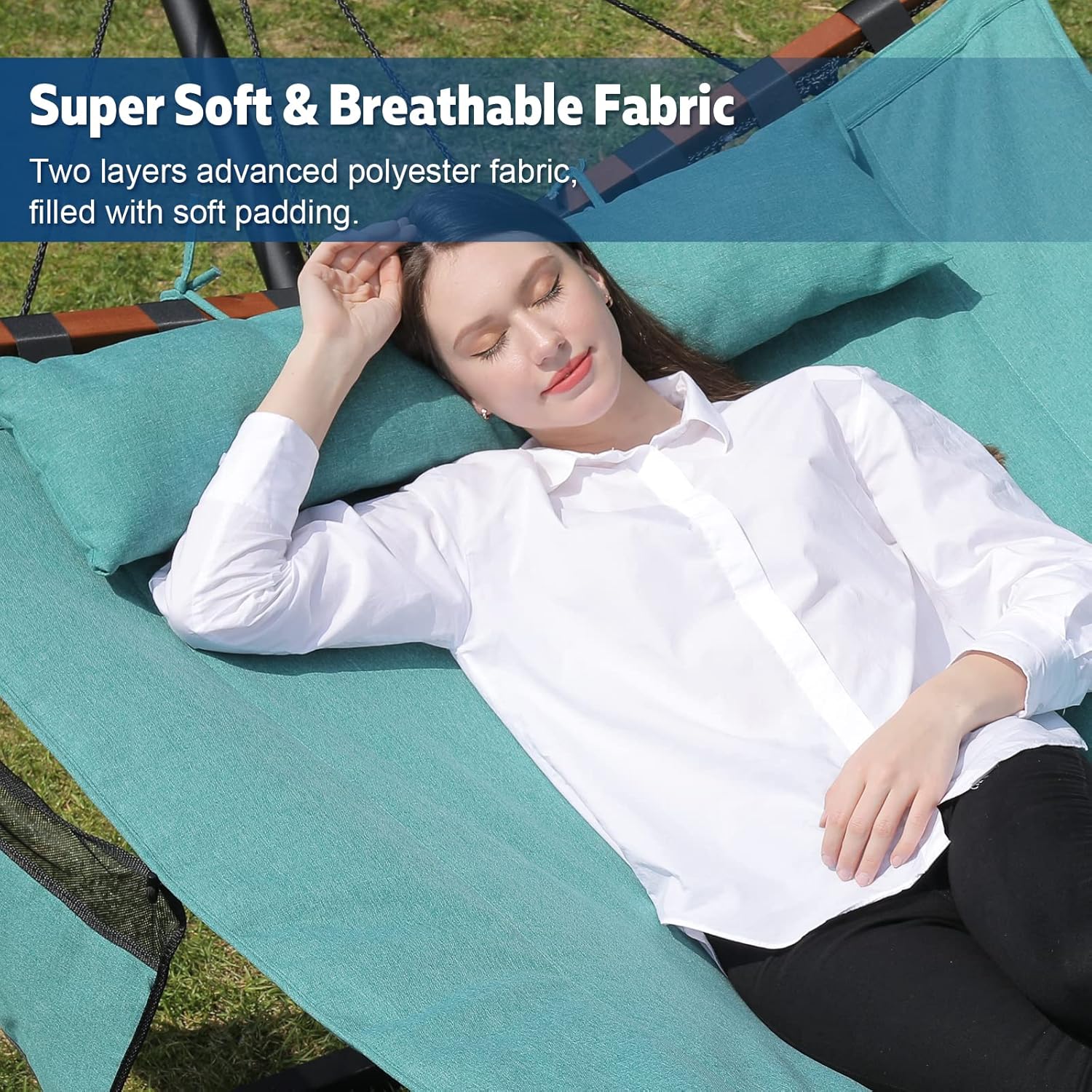 - ★Super Large Hammock: 55in width x 79in length large hammock bed can easily accommodate 2 people to enjoy the leisure time simultaneously (maximum 450lb capacity). The pillow is lengthened to 35.4in for two people. Besides, the hammock comes with a detachable side pocket for phone, books, cups and other stuffs for your convenience.