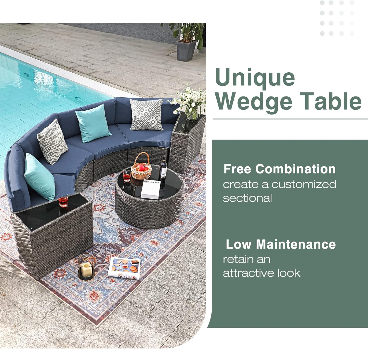 - EASY MAINTENANCE –Tempered glass tabletop end table with its peculiar wedge shape is ideal for serving and displaying a range of drinks and decorations. This set comes with a cover that keeps your patio curved furniture dry and safe from the elements.