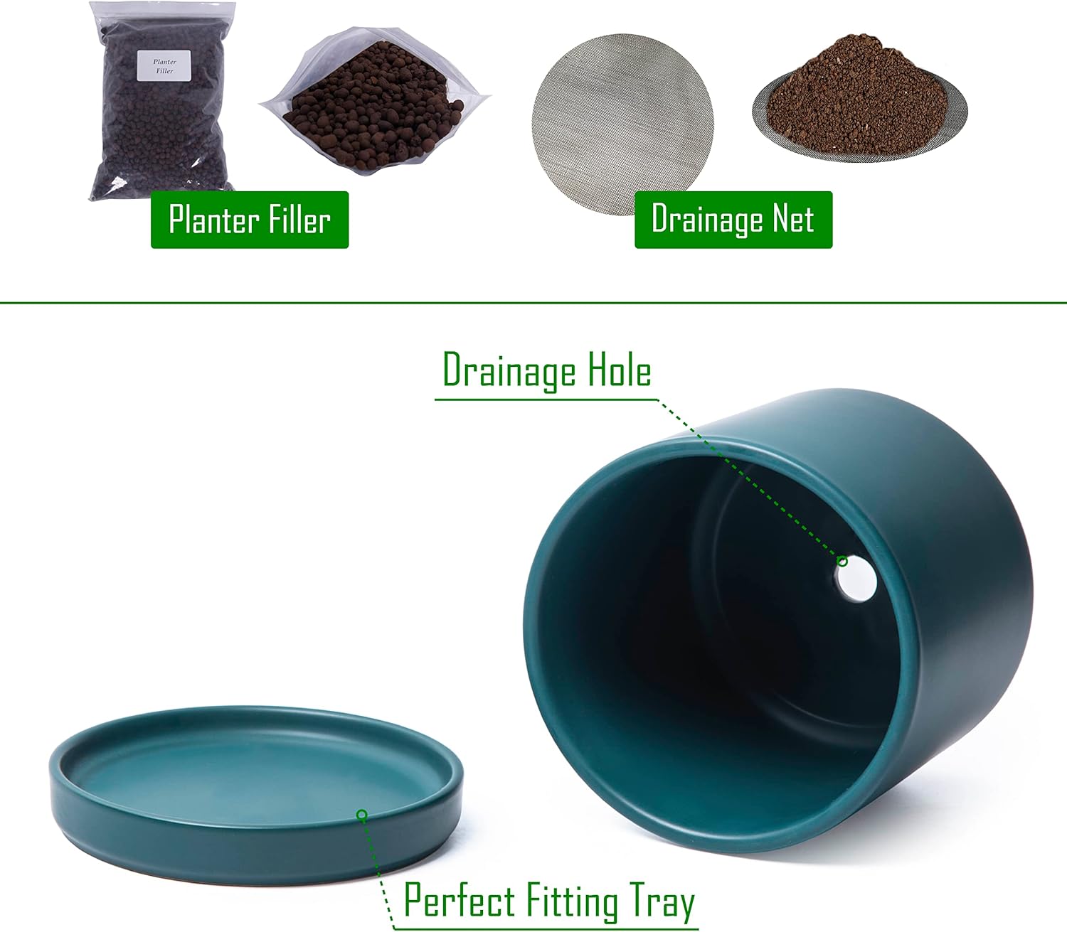 - Planter pot with drainage hole, mesh drainage net and protective scratch pad included.
