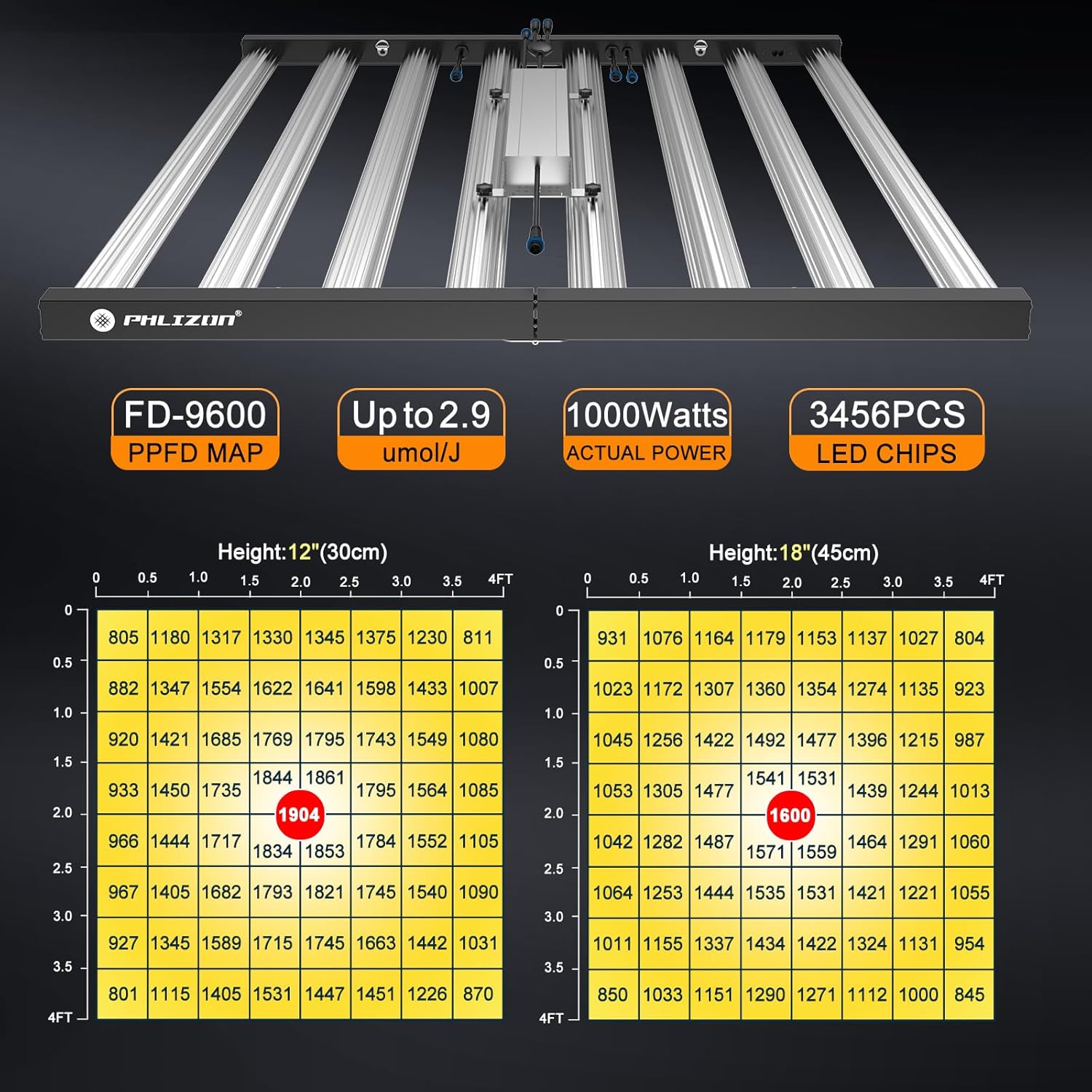 - USED WITH LEDS MAXIMIZE YIELD - The FD9600 series grow light use with LM281B led Chips 3456pcs high efficient SMD leds,boast the market-leading efficiency to 2.9 ยตmol/J and 2.5g yield per wattage with 30% higher Average PPFD, the actual power is 1000 watt.