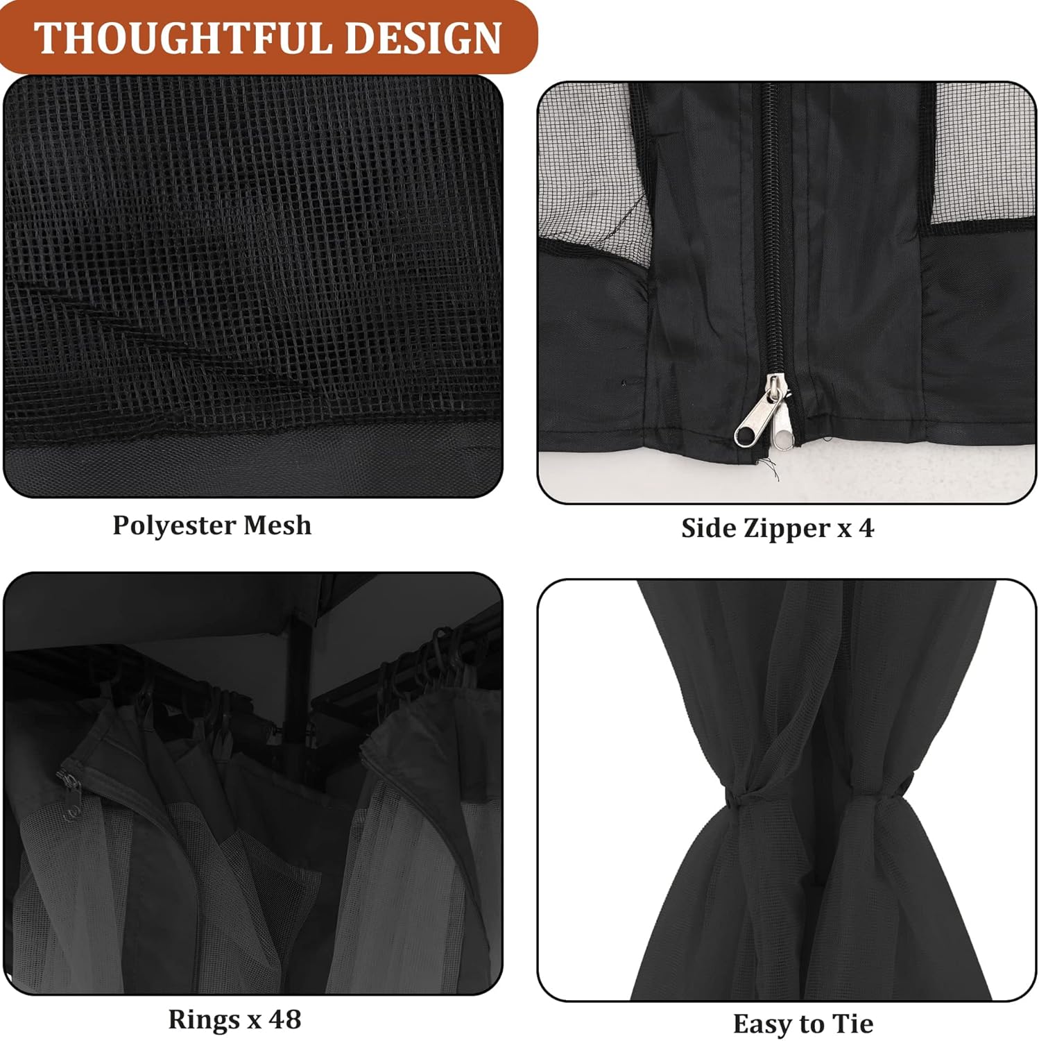 Gazebo Mosquito Netting Replacement 10' x 10' x 7'1'', Universal 4-Panel Screen Sidewall with Zipper, Black (Mosquito Net Only)