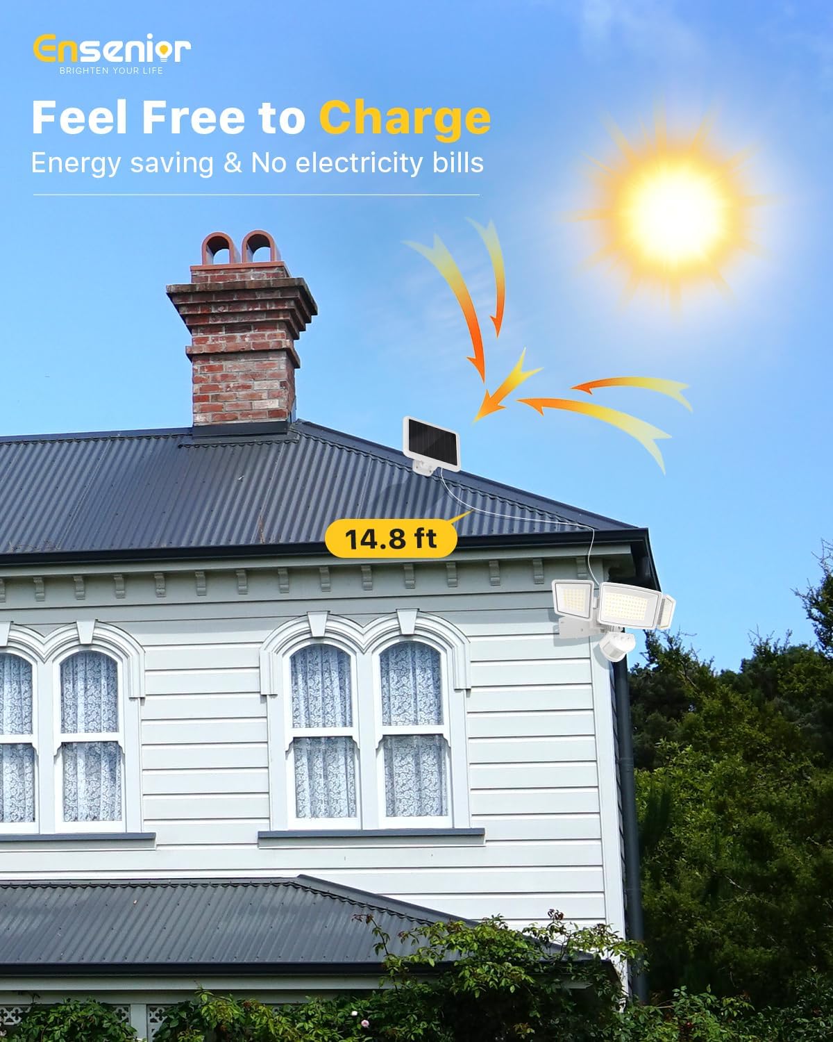 Ensenior 5 Motion Sensor Modes Solar Security Light, 1800LM 270° Wide Angle 3 Heads LED Flood Lights, IP65 Waterproof Wall Lights, Separate Solar Panel Remote Control Solar Lights Outdoor