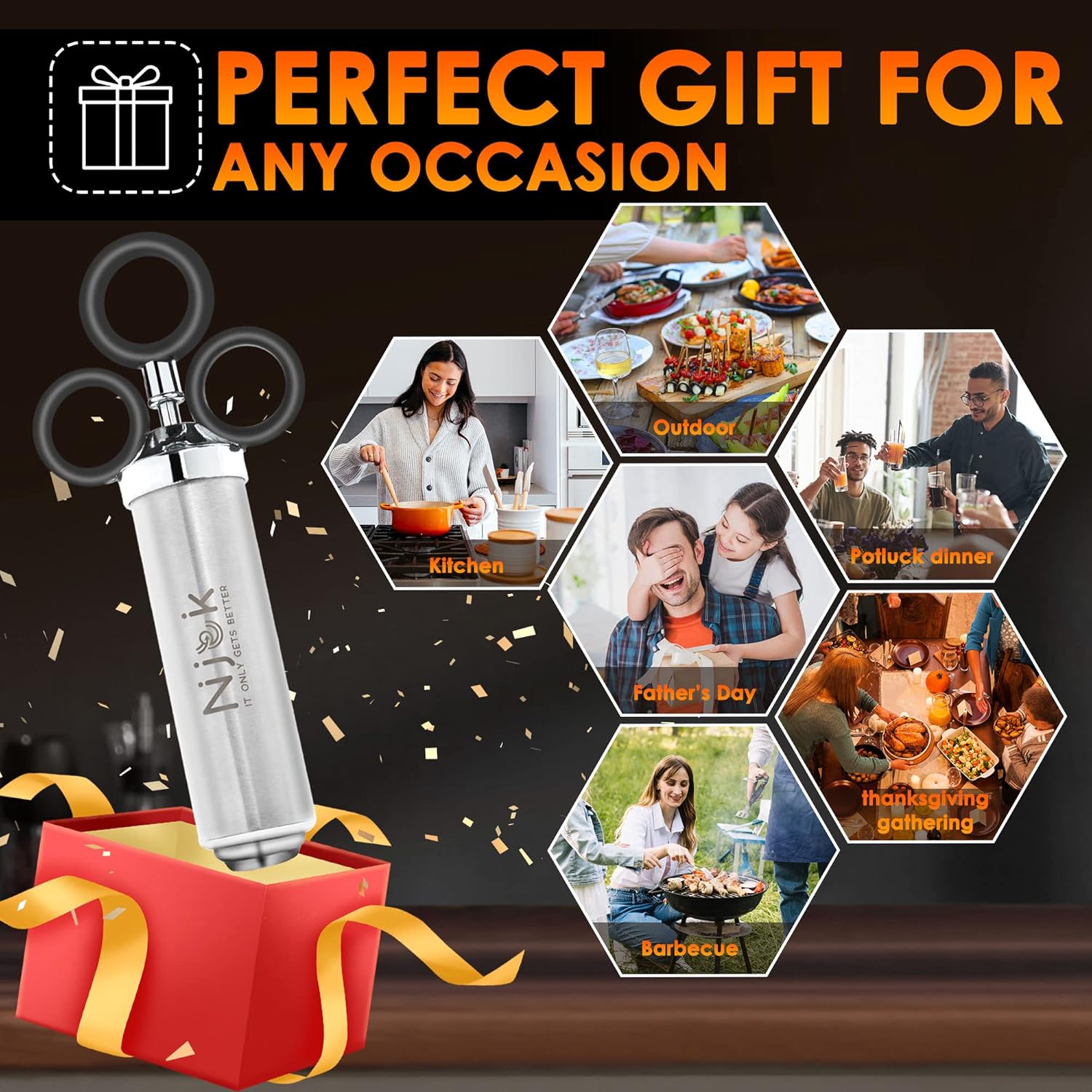 - Perfect for Any Occasion and Everybody: Whether you're a chef or a meat enthusiast; whether you are hosting a backyard barbecue, preparing a holiday feast, New Year celebration, smoky bonfire party, or just as a gift for dad, our culinary injector is a great tool for infusing flavour and moisture to your meats. With its professional-grade design and easy-to-use features, it is sure to become a staple part of your grilling season kit.