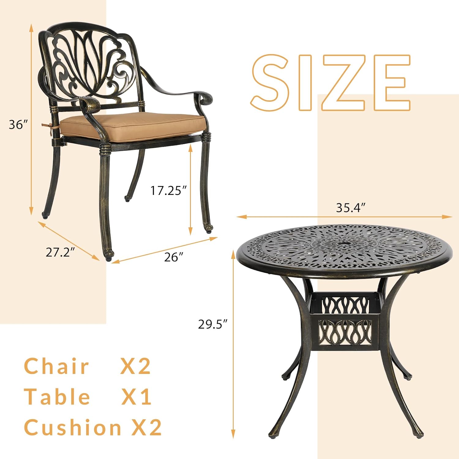 3-Piece Outdoor Patio Dining Set, All-Weather Cast Aluminum Patio Furniture Set for Backyard Garden Deck with 2 Cushioned Chairs and 35.4” Round Table, 2" Umbrella Hole