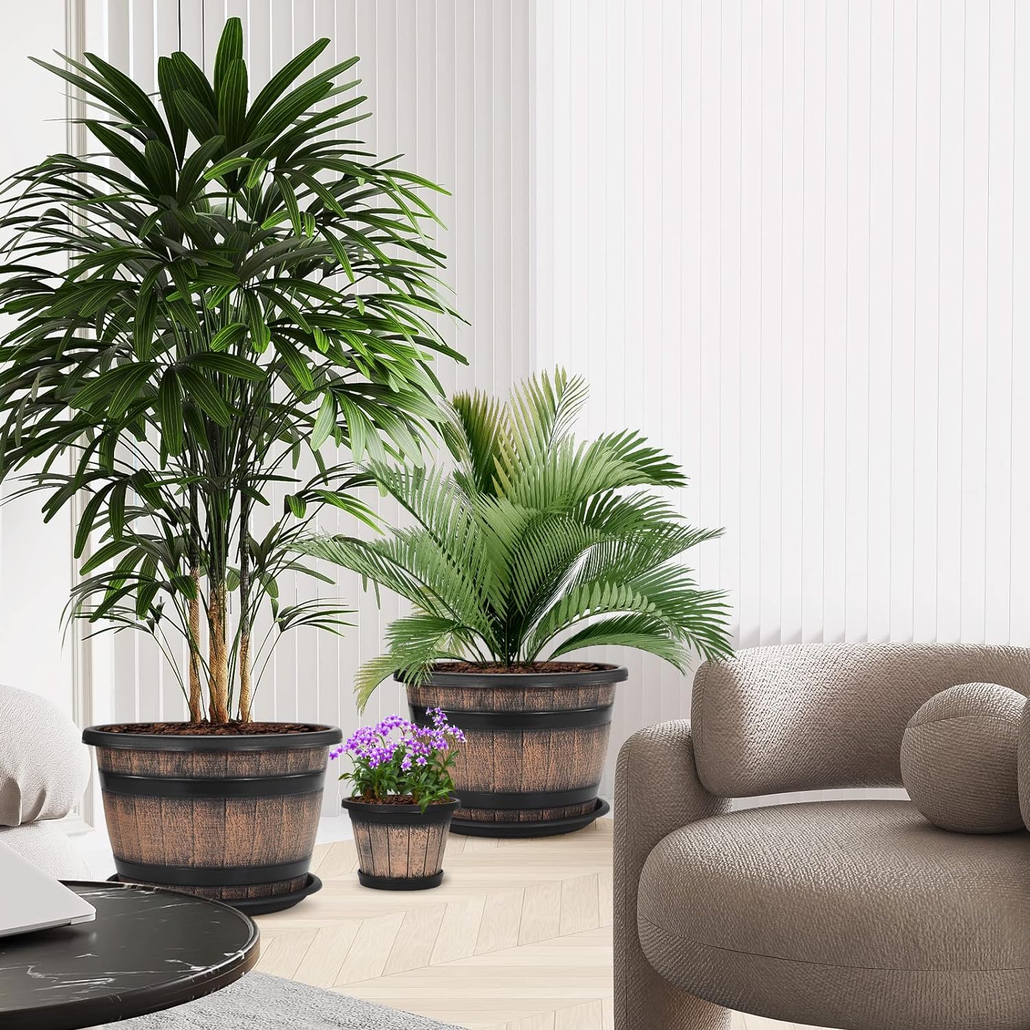 Quarut Plant Pots Set of 3 Pack 9 inch,Whiskey Barrel Planters with Drainage Holes & Saucer.Plastic Decor Flower Pots Imitation Wine Barrel Design,for Indoor & Outdoor Garden Home Plants (Brown)