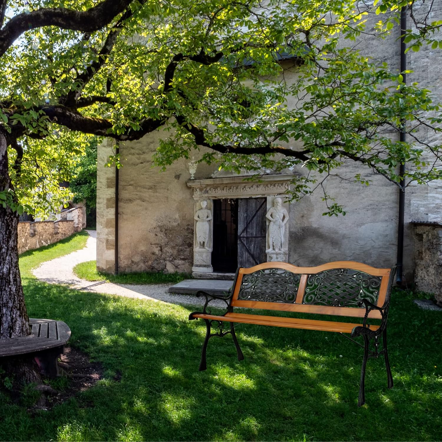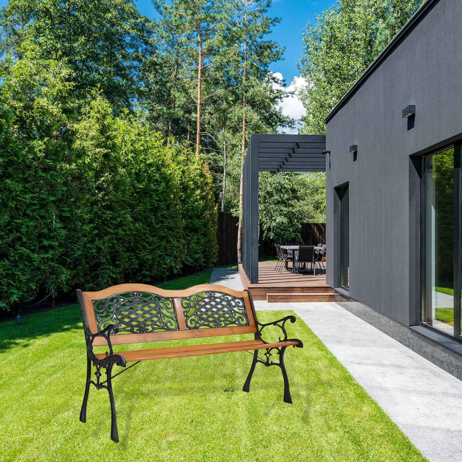 Outvita 49.5in Garden Bench, Patio Wood Love Seat with Metal Armrest Retro Style for Patio Porch Deck Yard Lawn Poolside(Classical)