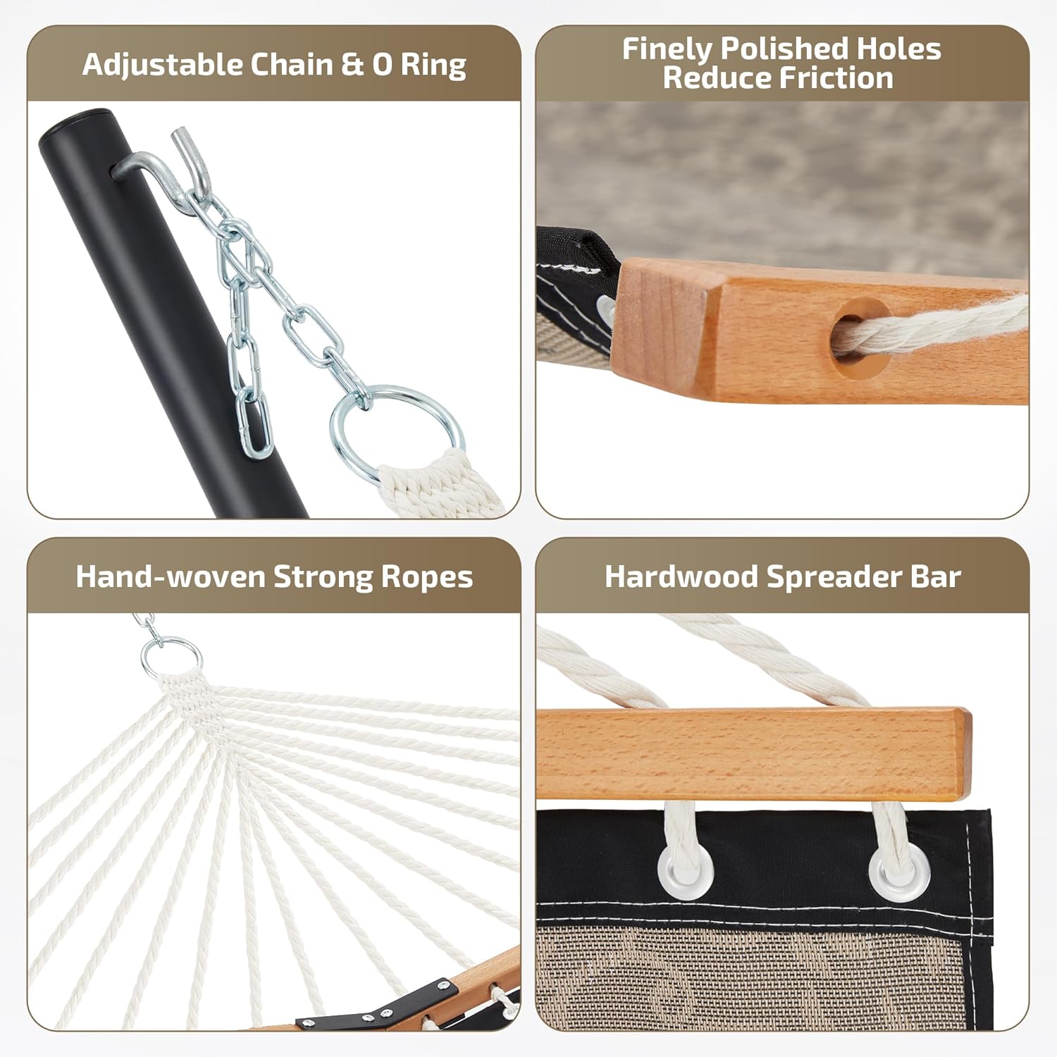 - 【Extra Large Size】The hammock bed size is 77 inches(L) x 55 inches(W) with stand size 144 inches(L) *36.5 inches(W)*38 inches(H), which is big enough for two adults. The adjustable long chains allow you to change the hieghts as you need.