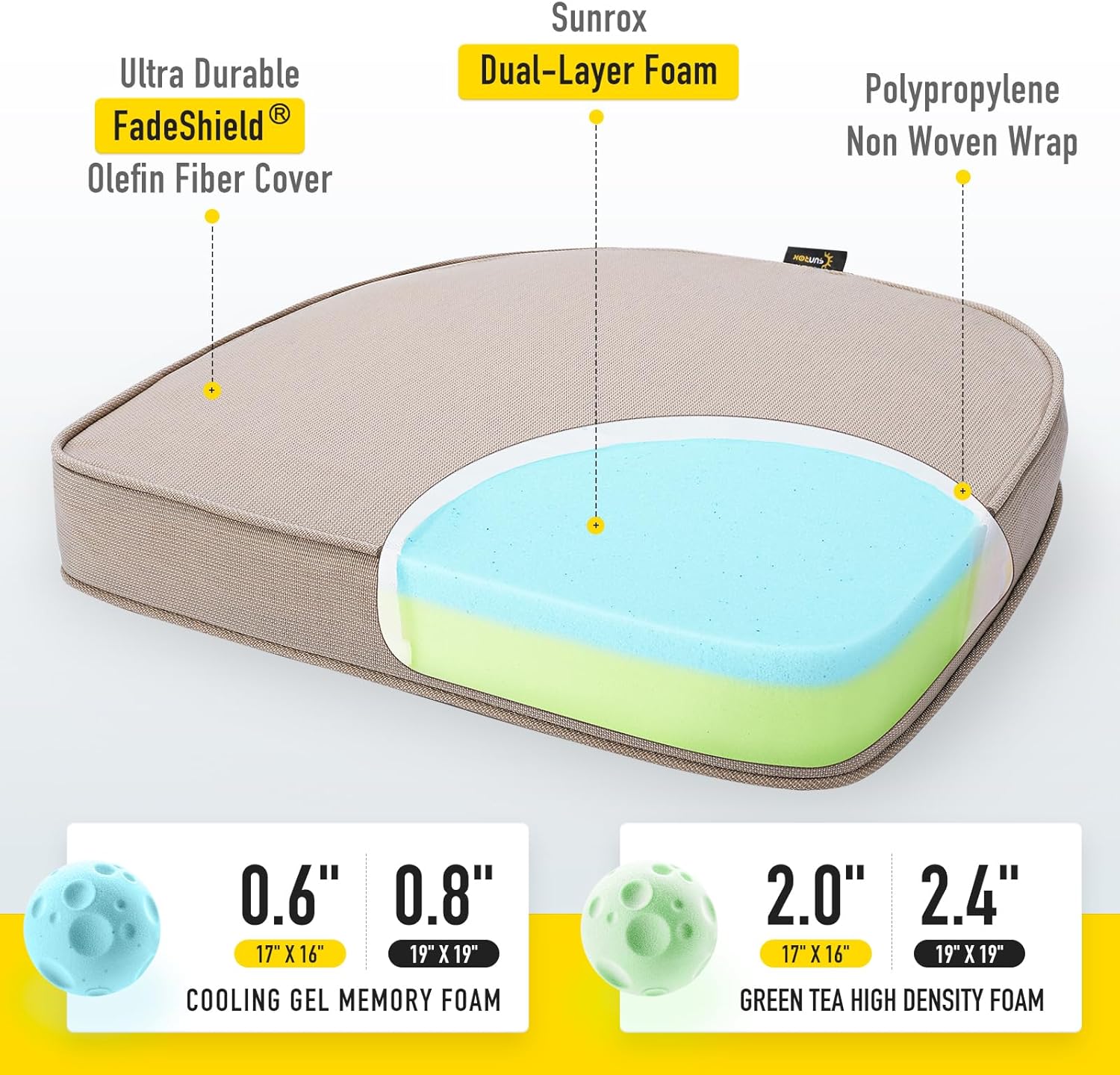 SUNROX Gel Memory Foam Chair Cushions, FadeShield Water-, Stain-Resistant Durable Reversible Seat Cushion Pads with Ties for Indoor/Outdoor Kitchen Dining Office, 19"x19", Set of 4, Husk Birch
