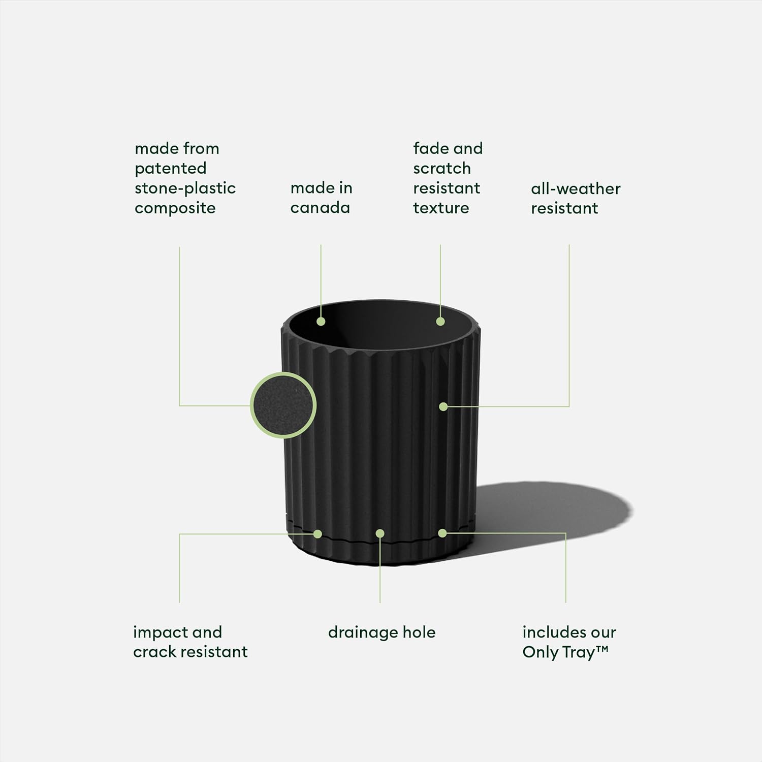 - Planter body made from a patented stone-plastic composite which provides the look of stone and durability of plastic