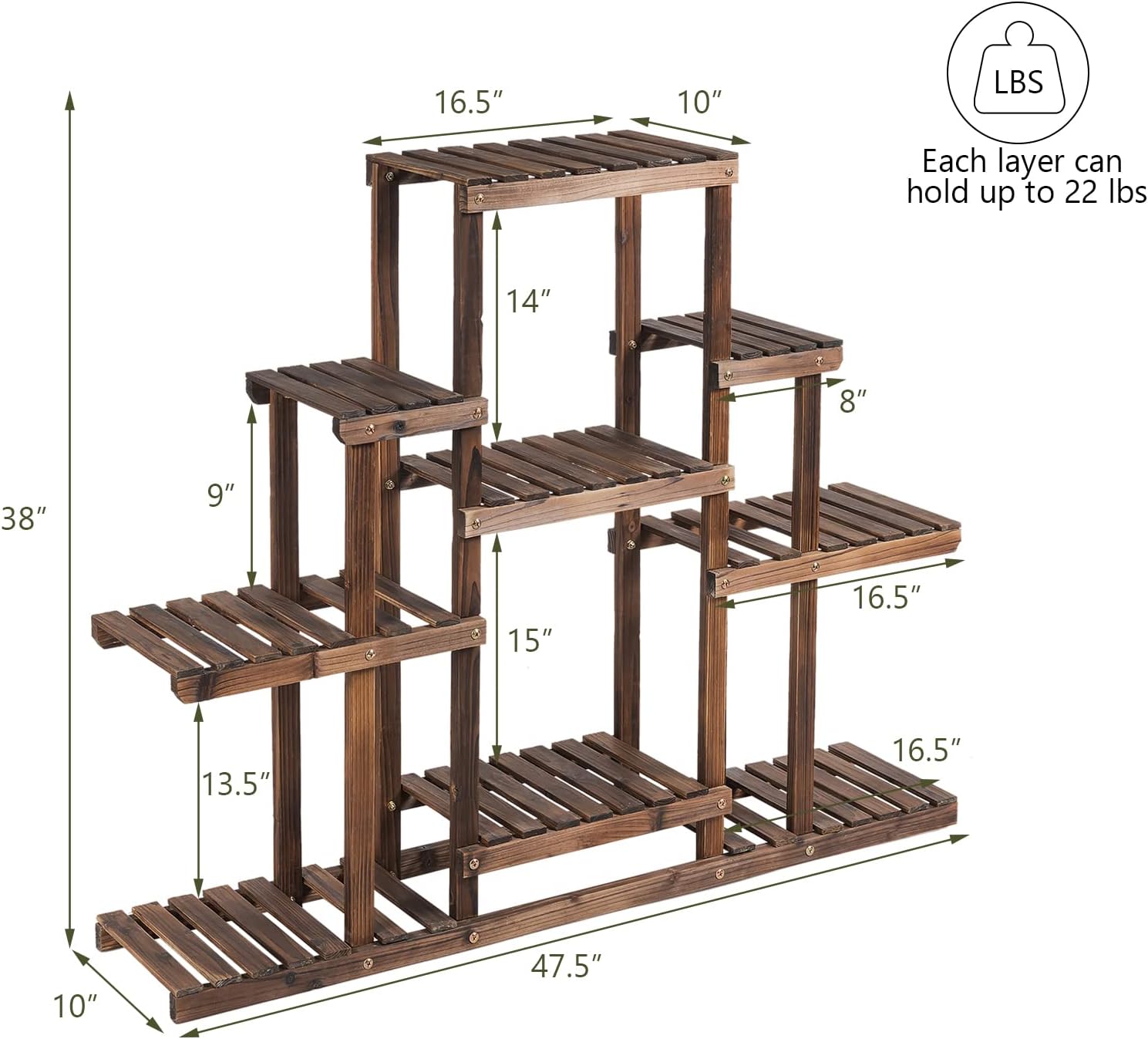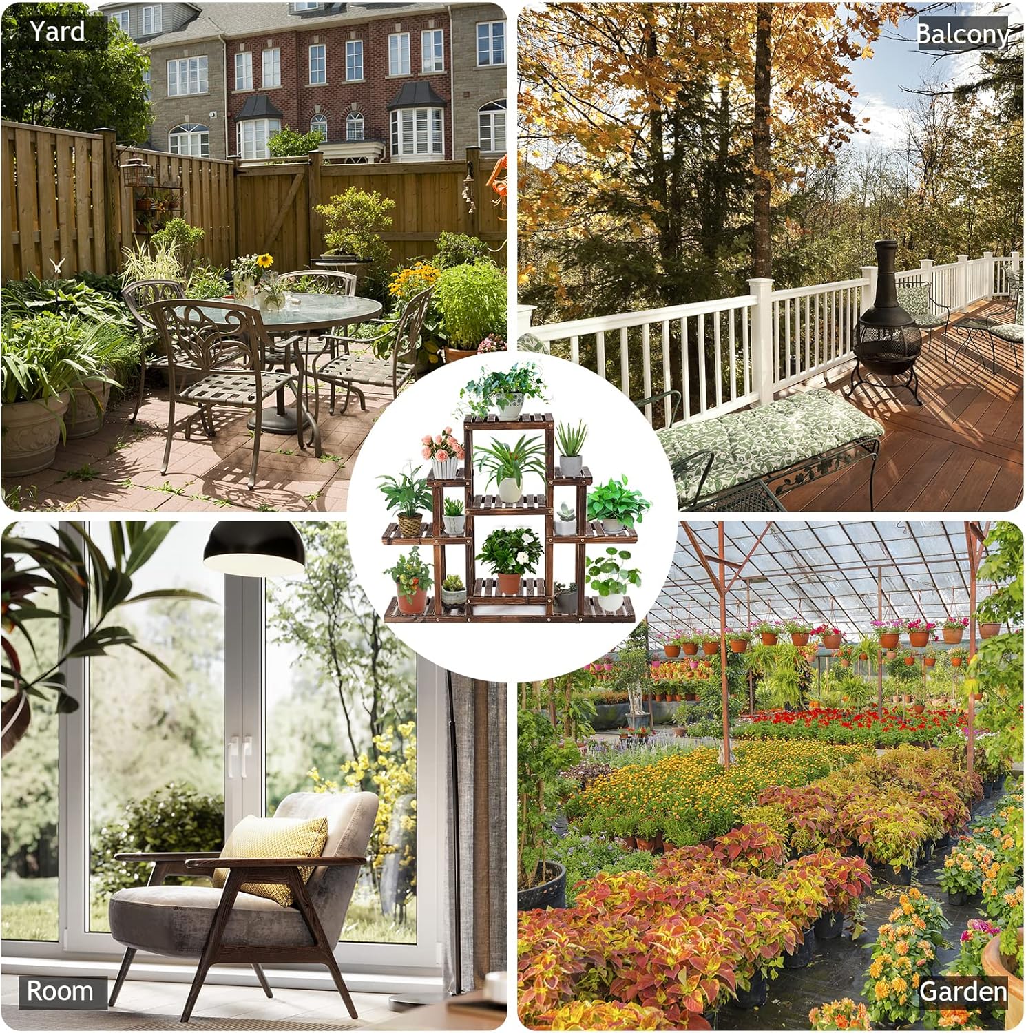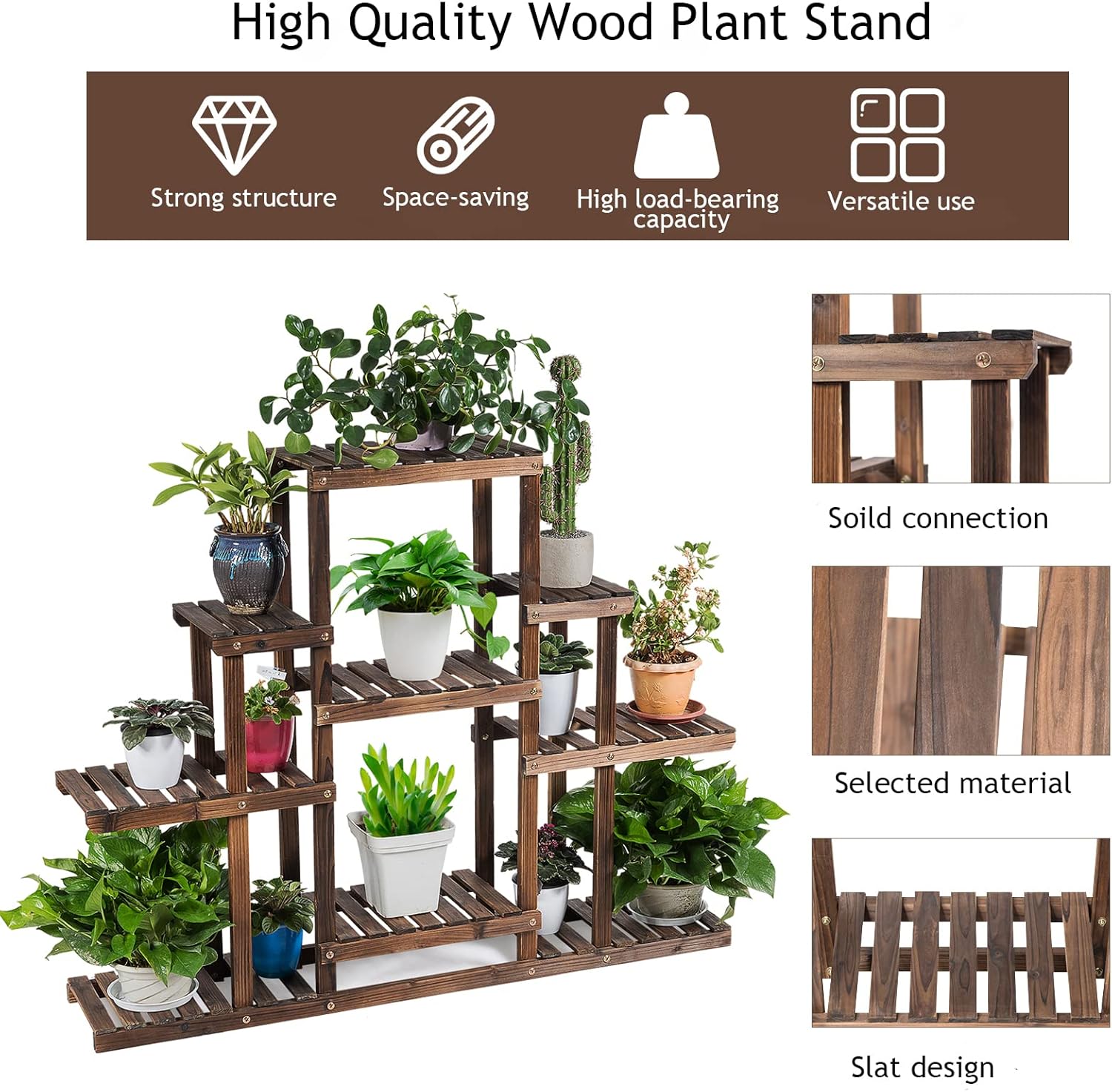 - [Stable Wood Structure] Made of full solid fir wood, our plant rack is good weather resistance and can be used for a long time. It has smooth edges to protect your hands from scratches. In addition, the plant stands have been carbonized to reduce the water content of the wooden plant stands by half, improving resistance to deformation. Moreover, the parts are tightly connected by screws to add stability and firmness.