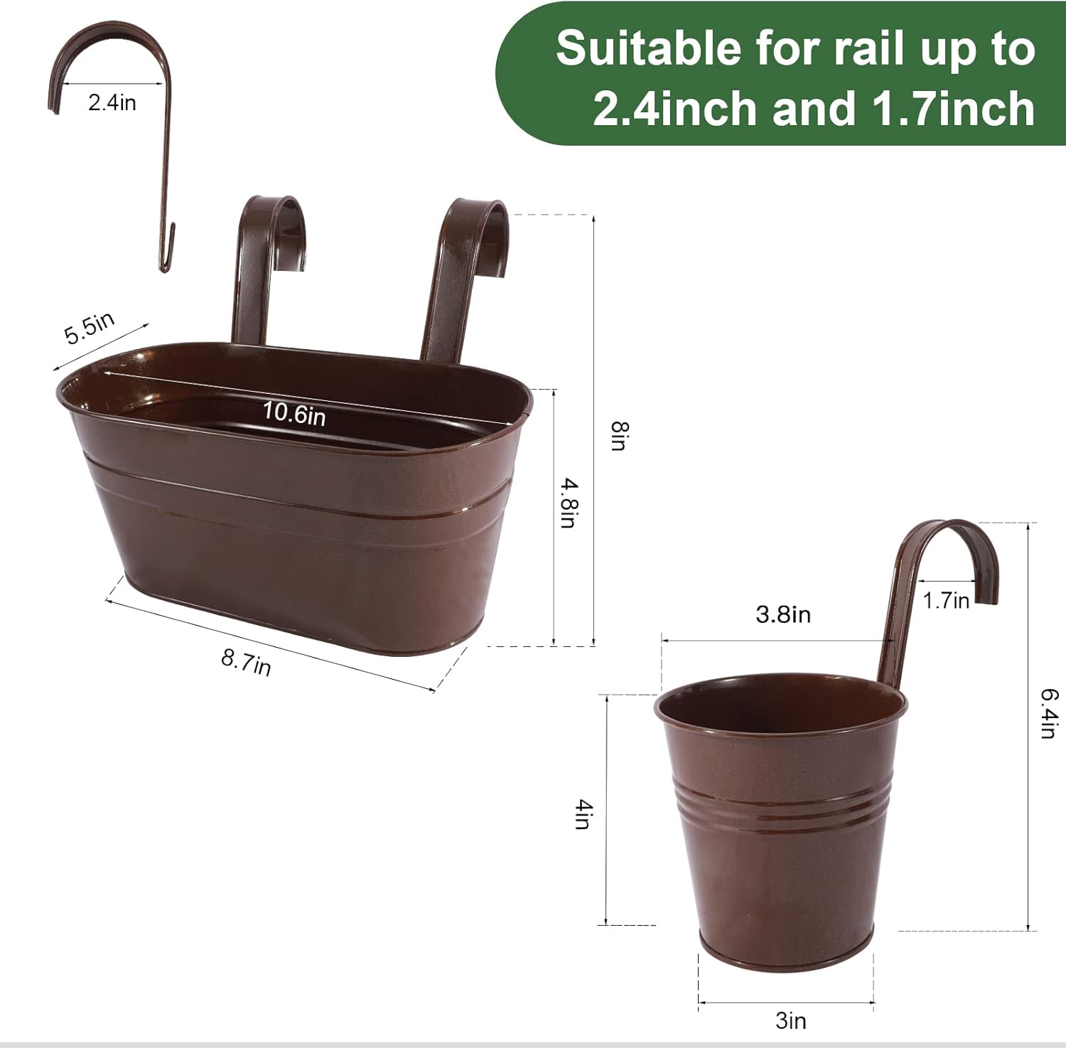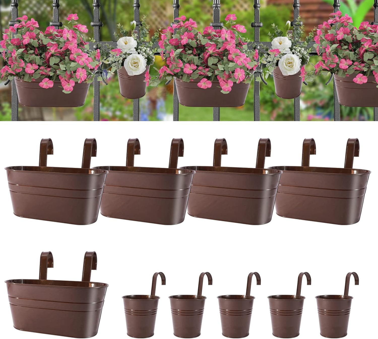 Metal Iron Flower Pots for Railing Fence Hanging Bucket Pots(5 Pcs) and Hanging Flower Pots Metal Iron Bucket Planter(10 Pcs) (Bronze)