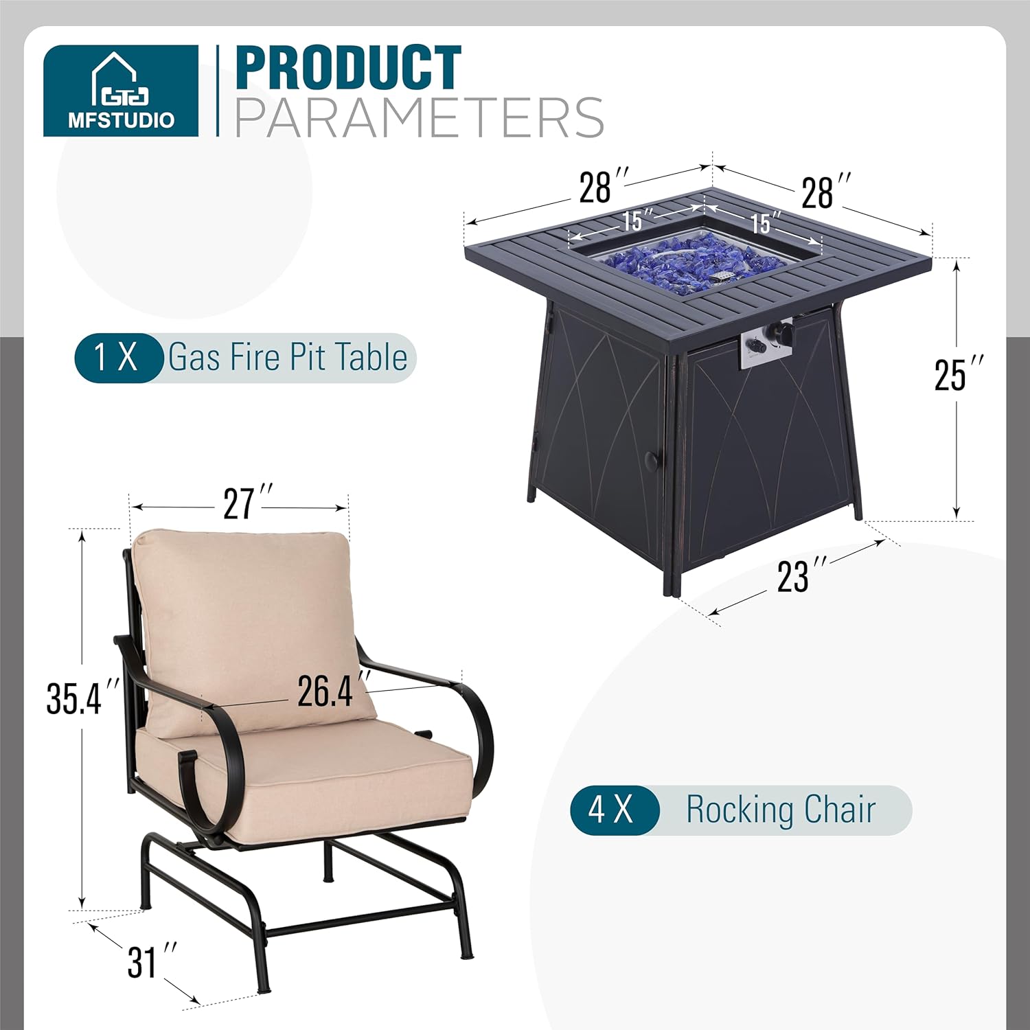- Tips: Package include 4*rocking chairs, 1 fire pit table, cushions and instruction. Notice: propane tank, blanket and other decorations are not included