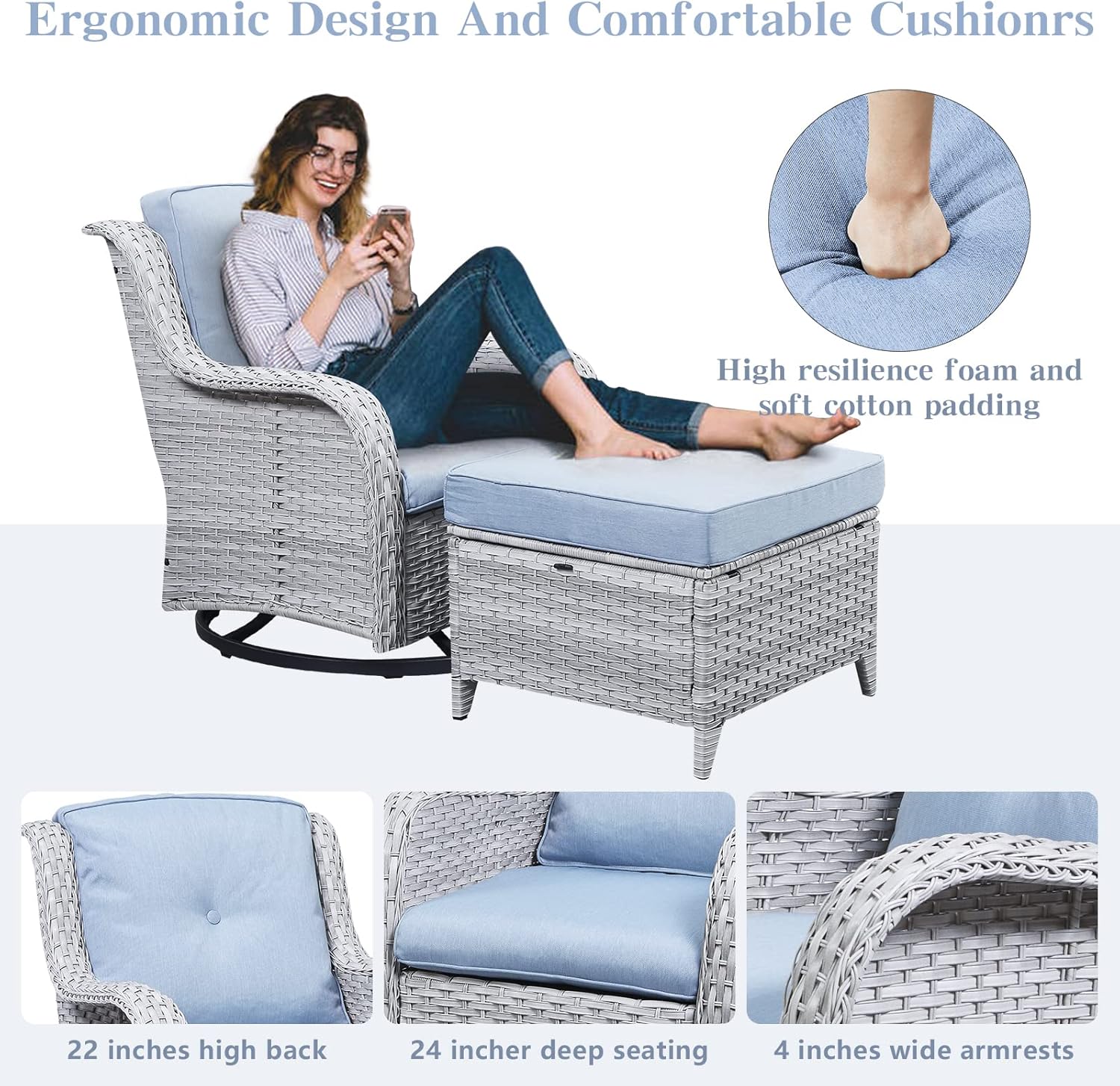 - Comfortable And Easy To Clean: Each glider chair and sofa in this outdoor set comes with a 4-inch thick foam seat cushion and an 8-inch thick cotton back cushion, which is ergonomic and enhances the overall comfort of the chair. The chair cushion cover is made of outdoor professional olefin fabric which is water resistant, and the seat cushion is equipped with zippers that are removable and easy to clean.