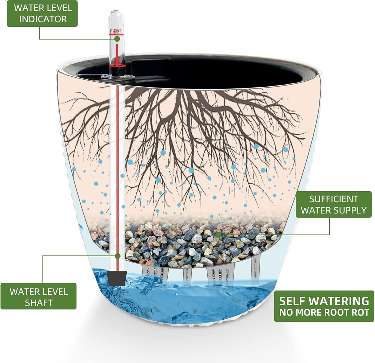 - NEVER MISS WATERING AGAIN - The hydroponic device keeps water ready, then watering time is at your discretion on the gauge. The design of drainage plug and spillway hole is to avoid cycles of overwatering and underwatering, pull out the plug to drain the excess water on rainy days outdoors. The sufficient water supply system enables double the water-efficient than conventional pots. Don't be anxious about missing watering while you enjoy a long term holiday on a journey or travel outside