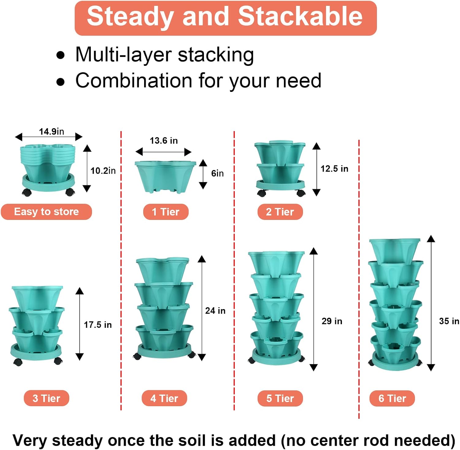 Vertical Planter 6 Tier Stackable Planters Garden Planters Strawberry Herb Flower and Vegetable Planter Indoor Outdoor Gardening Pots with Removable Wheels and Tools