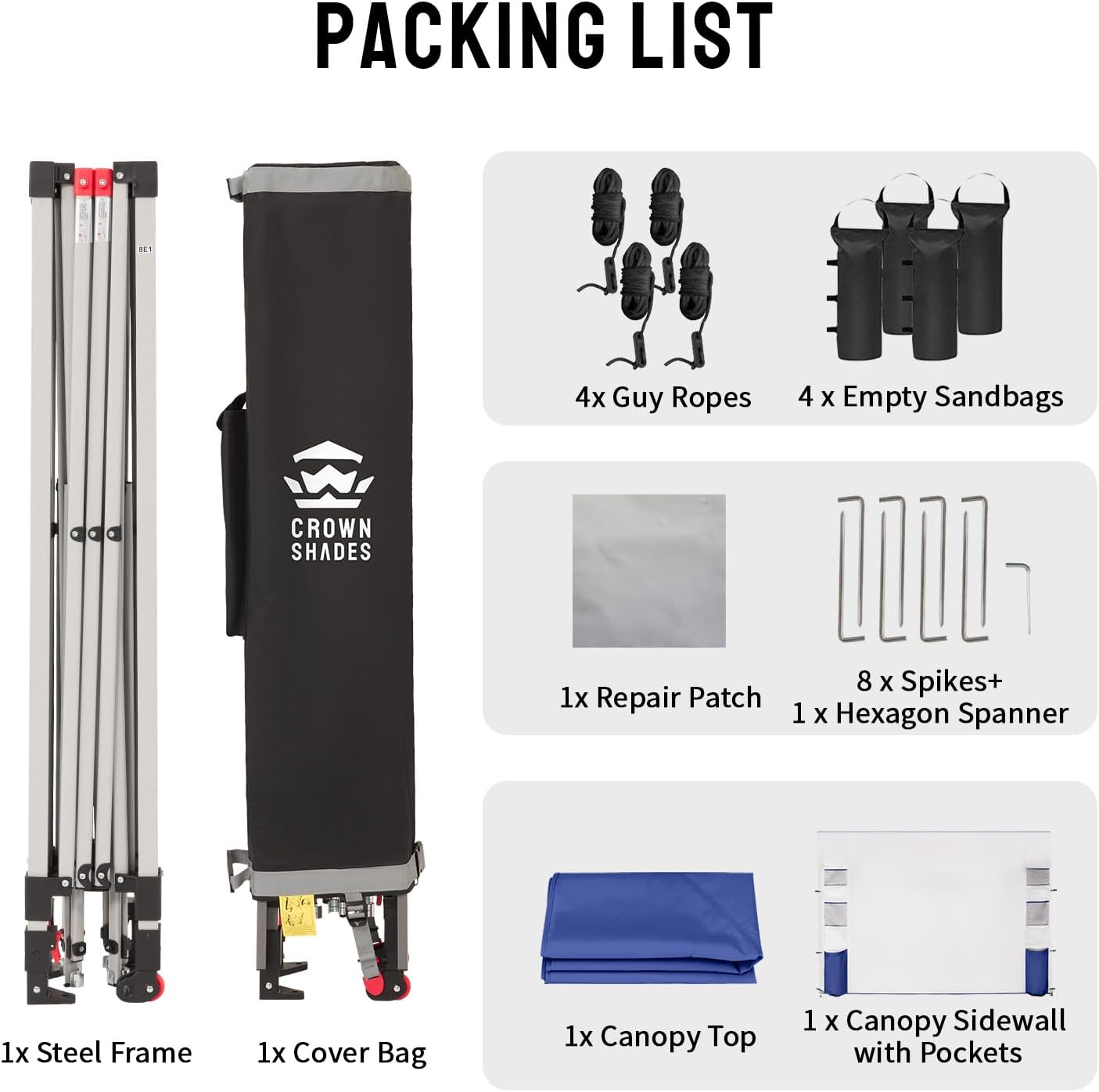 - STO’ N GO SYSTEM - Our lift-free storage and transport system makes it easy to collapse the canopy, cover it with the bag, and roll it away. The canopy can be stored with the fabric attached, with a specialized pocket for the sidewall, 4 sandbags, 8 stakes, and 4 guy ropes. Integrated wheels in the feet allow easy movement even when the canopy is set up, by simply lifting the side without wheels. This feature is useful for quick setup and takedown at locations like the beach, park, or market.