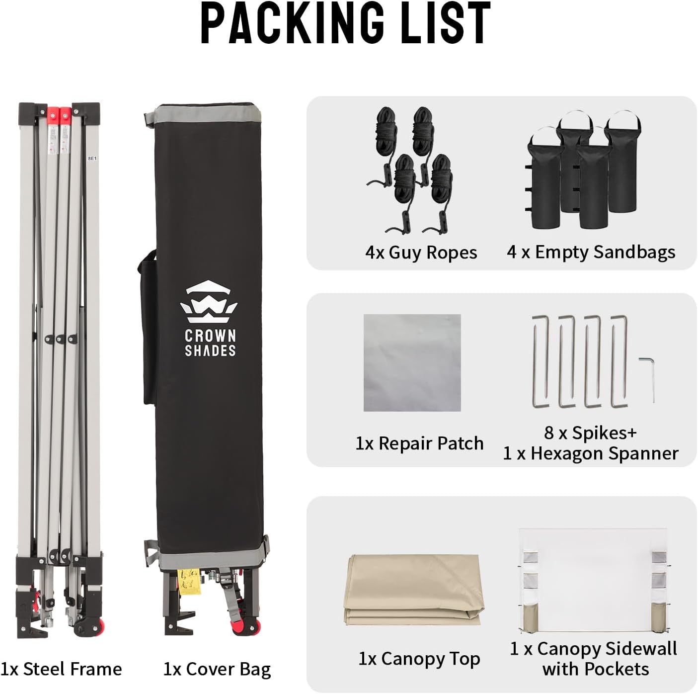- STO’ N GO SYSTEM - Our lift-free storage and transport system makes it easy to collapse the canopy, cover it with the bag, and roll it away. The canopy can be stored with the fabric attached, with a specialized pocket for the sidewall, 4 sandbags, 8 stakes, and 4 guy ropes. Integrated wheels in the feet allow easy movement even when the canopy is set up, by simply lifting the side without wheels. This feature is useful for quick setup and takedown at locations like the beach, park, or market.