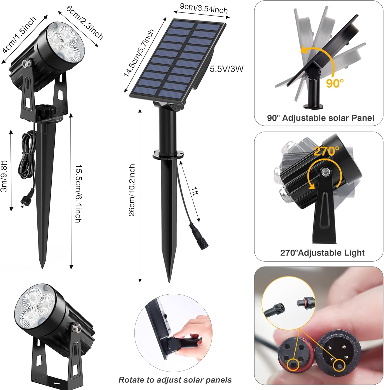 - 2-IN-1 Installation: The solar panel and light can be installed in the ground or mounted on the wall with included screws. Each spot lights with 118inch/3m cable, 180Β° Adjustable freely up or down to meet different requirements