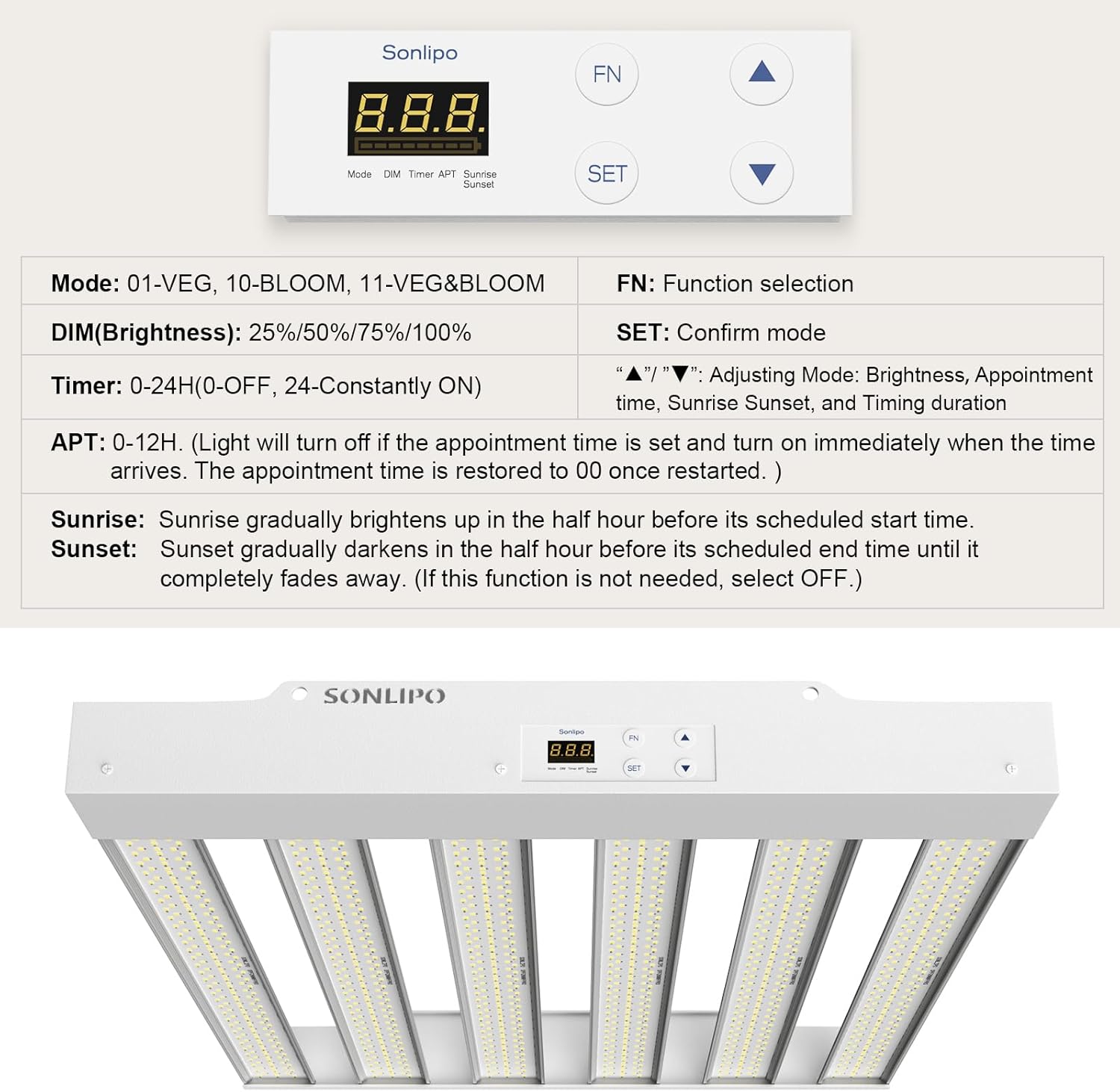 - Professional 3-Stage Full Spectrum: Sonlipo plant light is designed with 3 types of Sunlike full spectrum to meet the different growth stages of plants, including Seeding, Vegetative, and Flowering & Fruiting stages. This increases plant yield to a maximum of 2.9 g/w. The 3 full spectrum modes are controlled by a panel (VEG, V&B, BLOOM), suitable for all plants and all stages of plant growth.