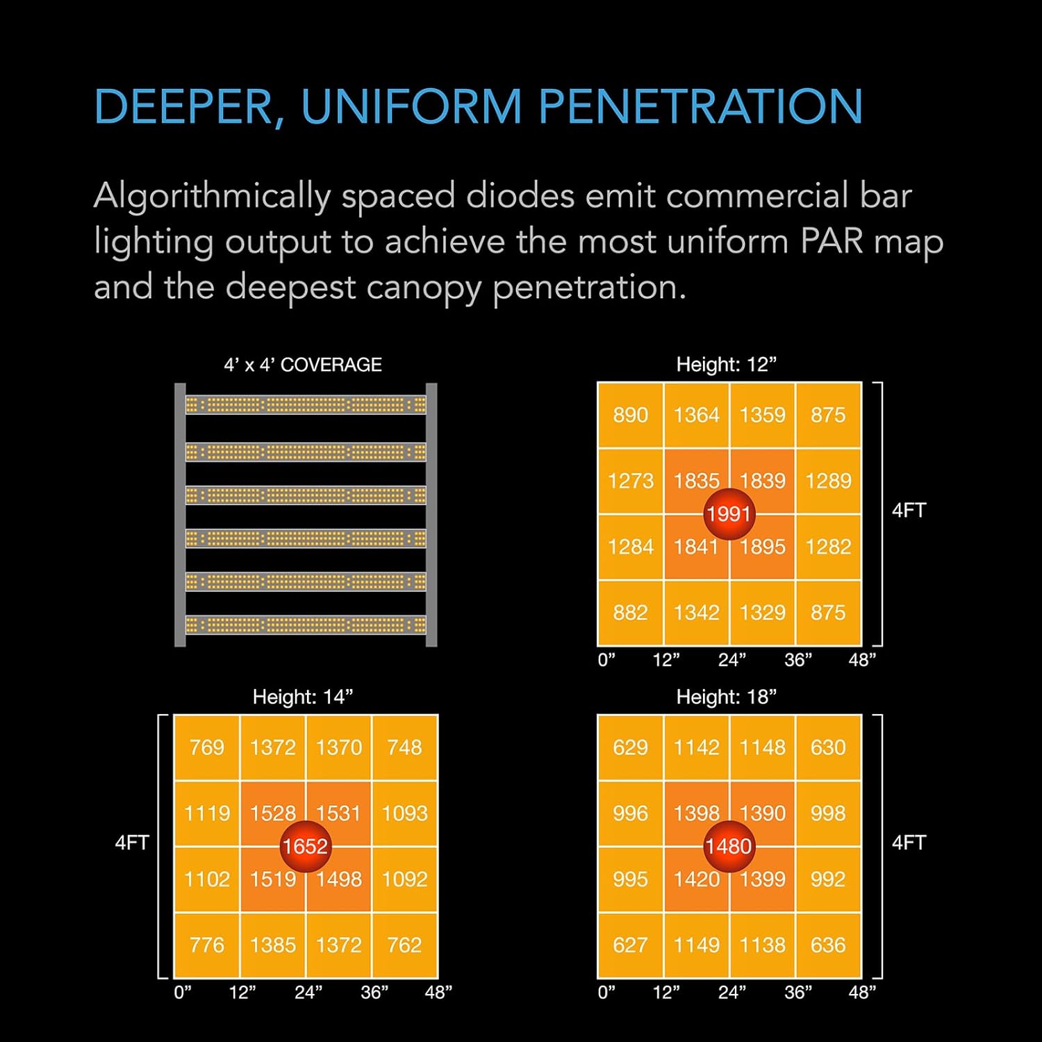 - Bar-style fixture with algorithmically spaced diodes optimized for even coverage, deep canopy penetration, and hotspot reduction.