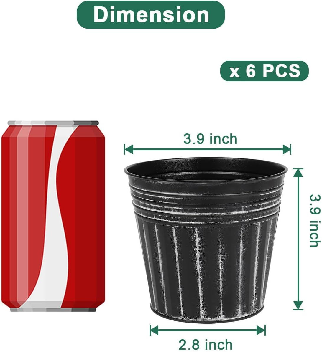 - 【Size of Metal Flower Pots】There are 6pcs metal planters in a package. The topper opening diameter 3.9 inches, the bottom diameter 2.8 inches, and the barrel height is 3.9 inches. These tin buckets have ample space for plant growth, making them ideal for succulents, herbs, and flowers, keeping your greenery vibrant.