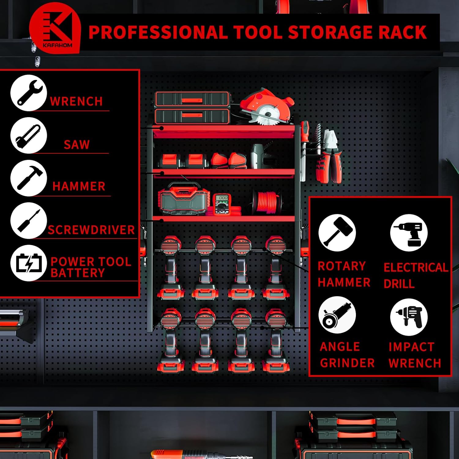- COMPACT SOLUTION: KAFAHOM tool organization and storage has a high capacity for all your tools! With two downside racks, it can hold up to 8 drills and heavy-duty power tools, while the 3 extra upper layers provide ample space for accessories such as hardware boxes, wrenches, screwdrivers, and pliers. With clever space design, our tool rack wall mount shelf helps free up space and keep your garage organization area clean and tidy.