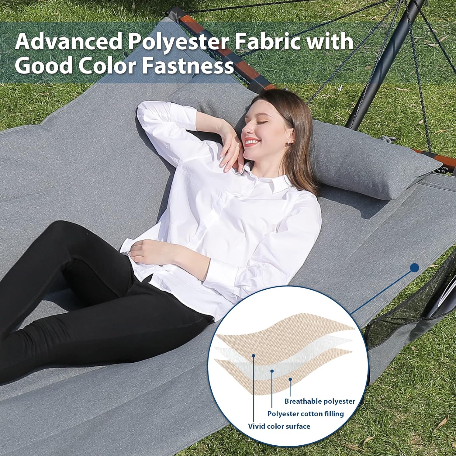 - ★Premium Weather-Resistant Polyester Fabric: Two-layer quilted fabric hammock, filled with soft padding. Resting on our hammock for a moment feel like laying on the cloud. After strict selection, we use a kind of premium polyester fabric for our hammock which has better color fastness and brings you more comfortable feeling.