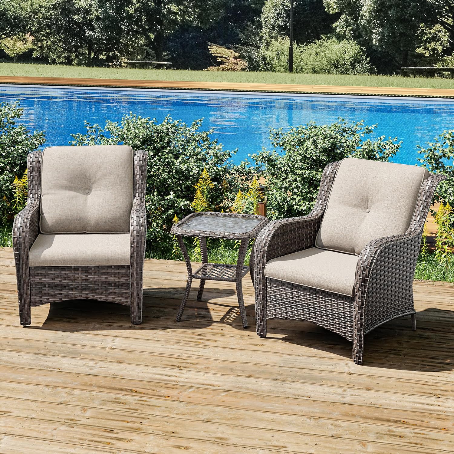 - 【Satisfying Comfort】 The spacious seating space is wide and sturdy. Ergonomic armrest and deep seat makes the patio furniture set cozy. The comfortable atmosphere, soft and thick cushion, giving people strong lumbar support and making you feel comfortable and relax