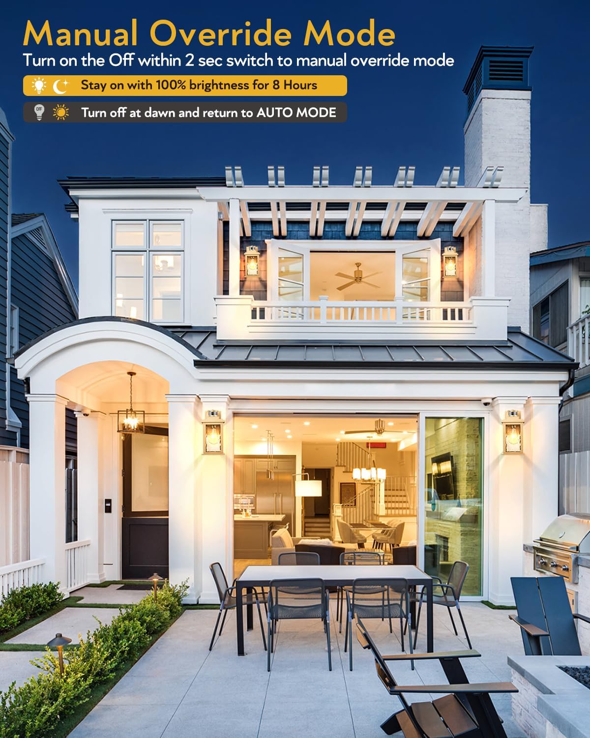- ✨[ New Generation Of Motion Sensors ] Our outdoor wall light has three convenient modes and a one-button switching function, so you can easily choose the perfect lighting option to suit your needs. ① Dim Mode: offers 30% brightness at night, with 100% light once motion is detected. ② ECO+ MODE: the light is fully off at night, coming on at 100% brightness once motion is detected. ③ Override Mode: keeps 100% brightness at night, with lights automatically turning off during dawn in each mode.