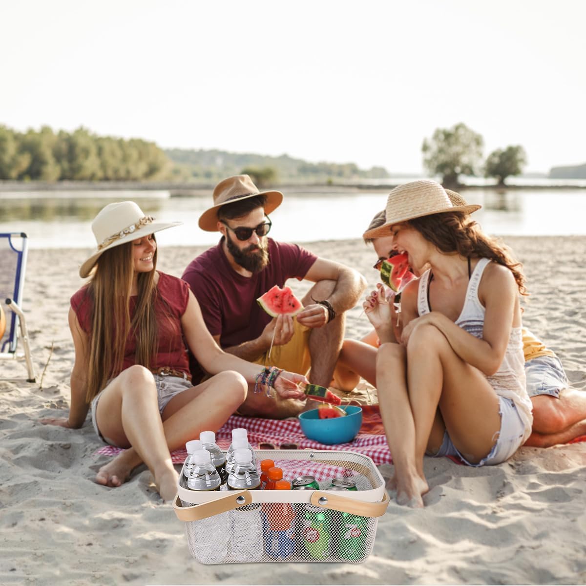 Portable Mesh Harvest Basket - Natural Bamboo Handle Foldable Organizer for Kitchen, Garden & Picnic | Ventilated Storage Bin with Rust-Proof Wire, Space-Saving Farmhouse Decor (White)