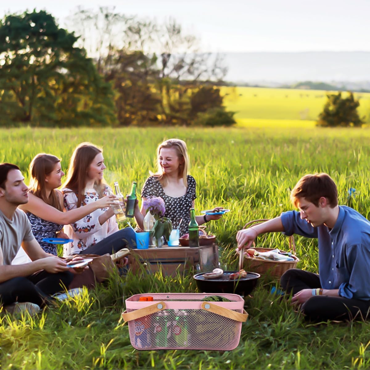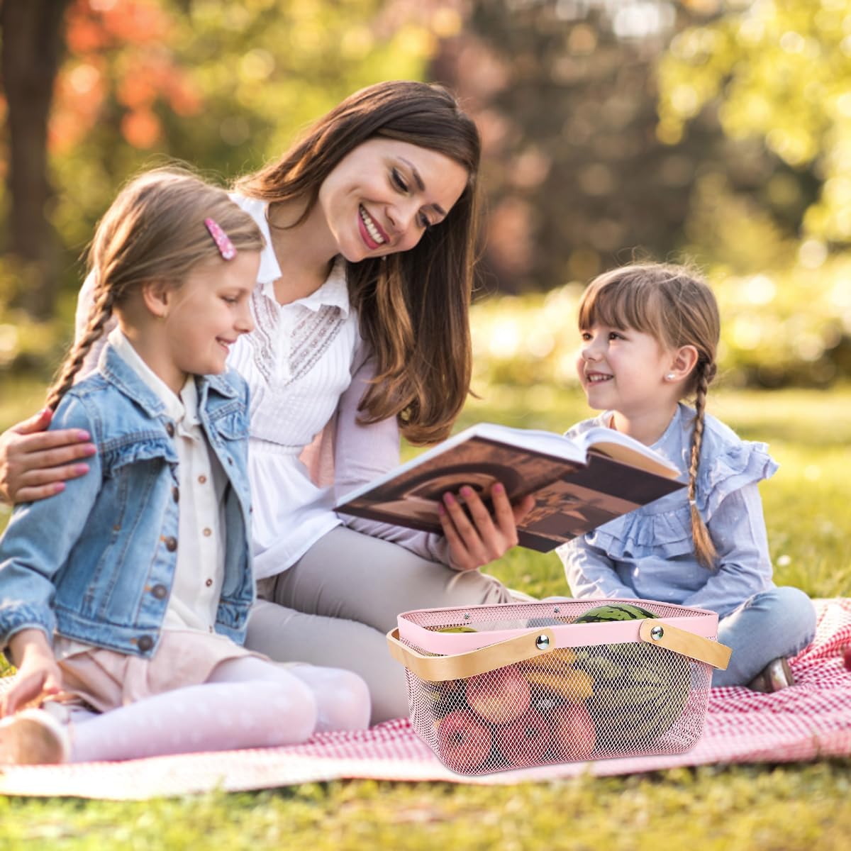 Portable Mesh Harvest Basket - Natural Bamboo Handle Foldable Organizer for Kitchen, Garden & Picnic | Ventilated Storage Bin with Rust-Proof Wire, Space-Saving Farmhouse Decor (Pink)