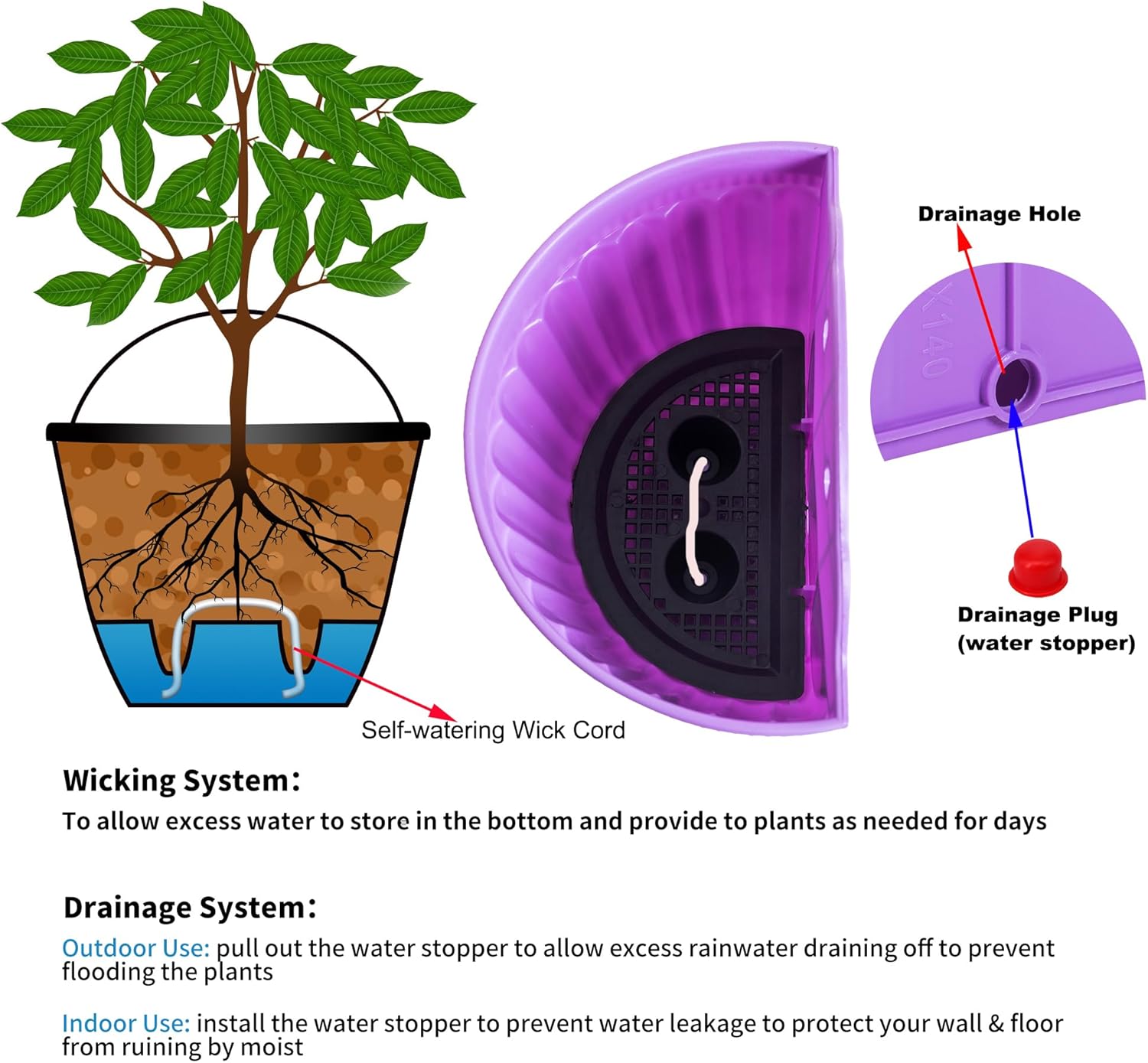 - Wicking System & Drainage System: Hanging planter pots with drainage mesh to allow excess water to store in the bottom of this lazy flower pot and provide to your plants as needed to ensure plants take enough water they need for days, and you don't have to water them frequently. This clever hanging flower pots may help you care your plants when you go outside a couple days or on business. Its small drainage hole drains off excess rainwater when installed outdoors.