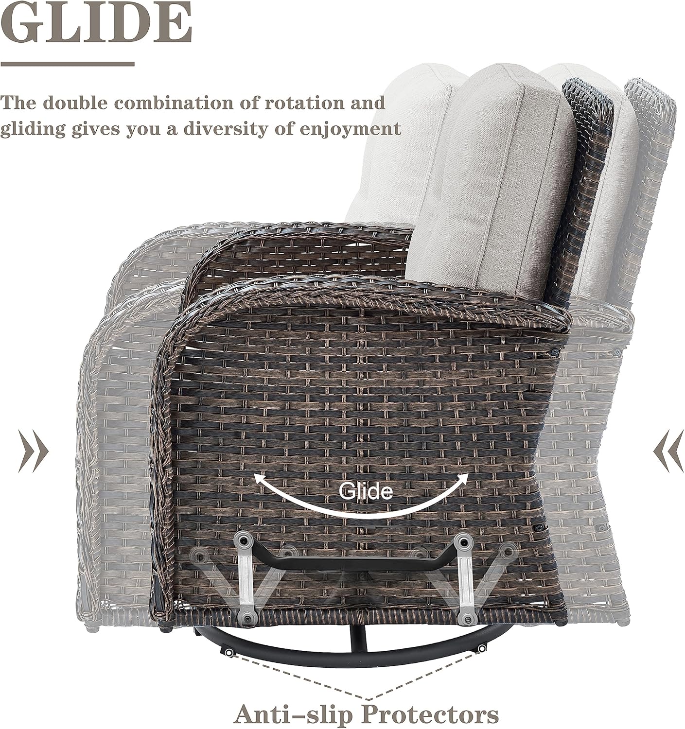 - 2.Sturdy Rust-proof Frame: These patio wicker swivel chairs base is made of high-strength iron, which is perfect for outdoor use, sturdy and not deformed, also has excellent weight-bearing capacity. The high backrest and soft cushion are perfect for relaxing in the warm sunshine.